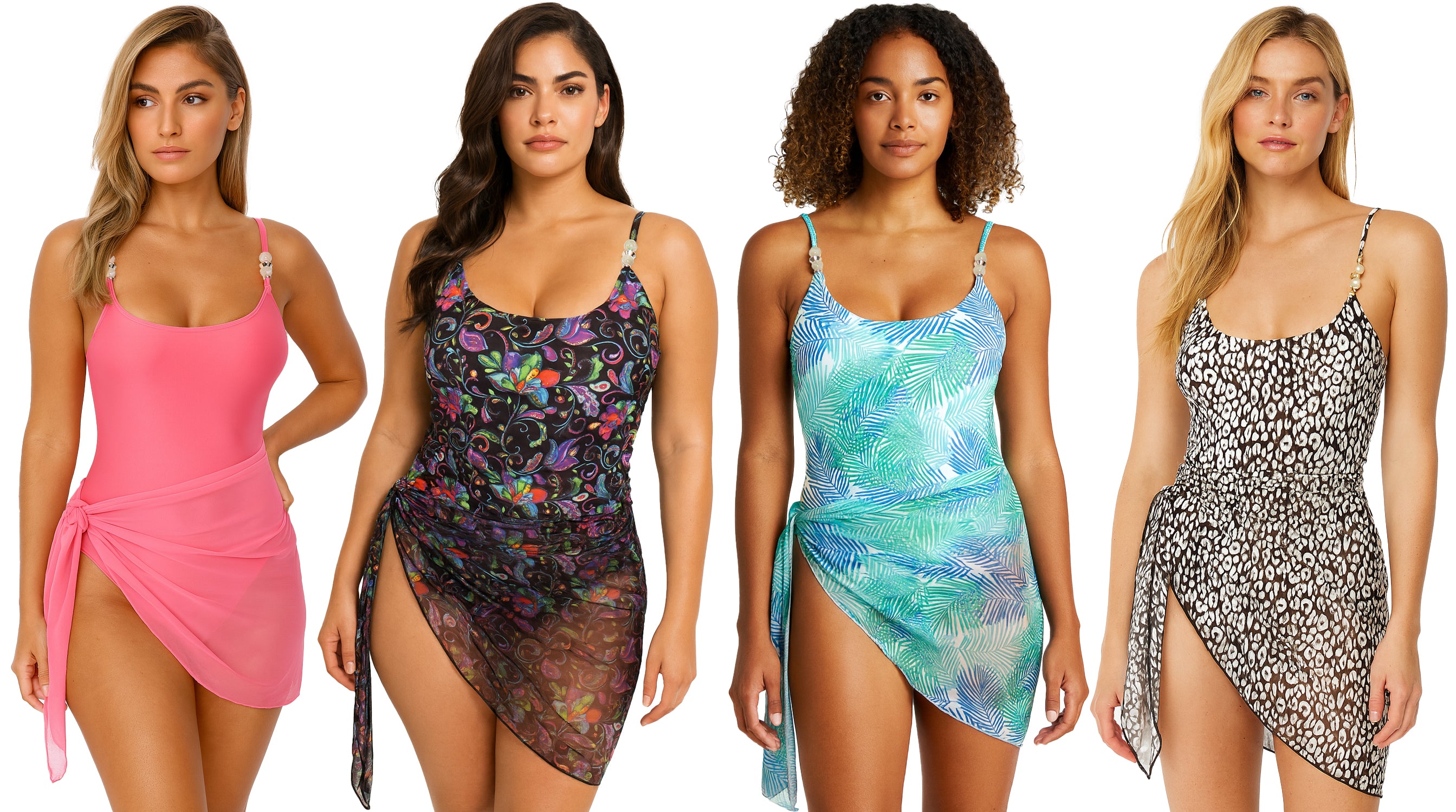 Wholesale women's beaded strap one-piece and sarong set. The set includes a scoop neck one-piece with beads on each adjustable strap, and a matching sheer sarong. Comes in solid pink and 3 vibrant prints in sizes S - XL. Hangers included.