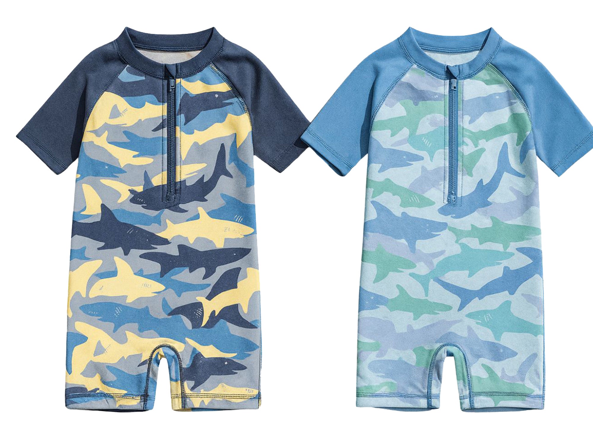 Prints & Colors: Blue/Green/Gray & Blue/Yellow/Gray Colorways with Shark Print
