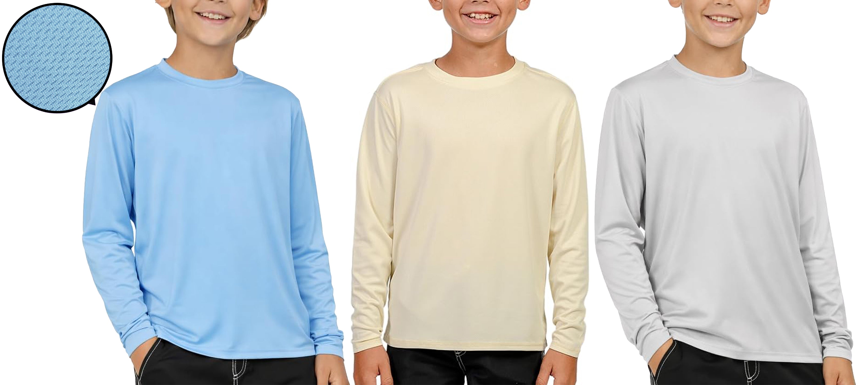 Wholesale Boy's Solid Long Sleeve Rash Guard. Relaxed fit, breathable, quick-drying material. Comes in light blue, light gray, & tan. UPF 50+ protection. Comes in sizes XS-XL