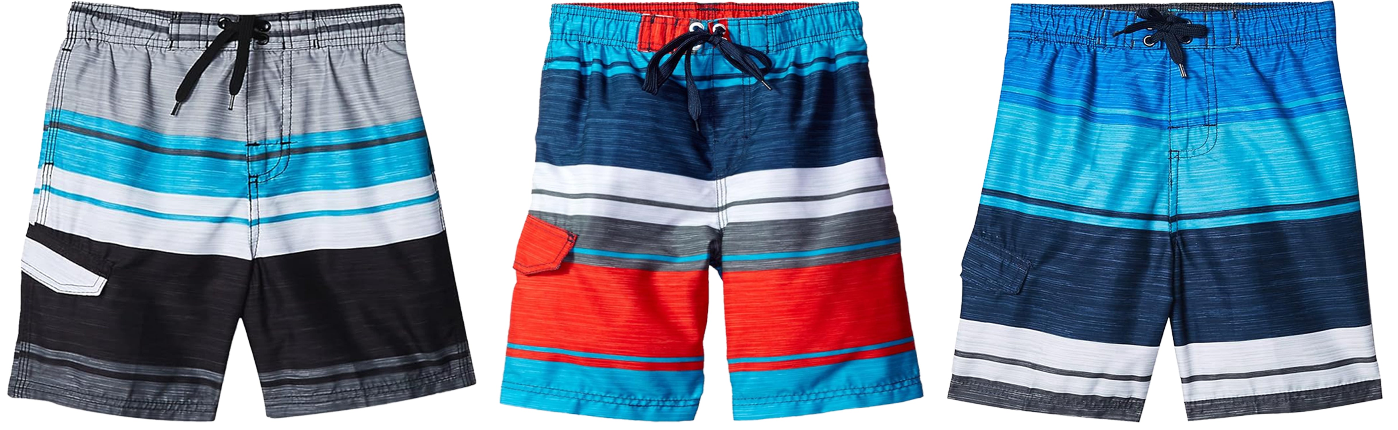 Wholesale little boy's striped swim trunk. Lightweight, quick-drying microfiber fabric with UPF 50+ protection. Comes in black, navy/red, and navy colorways. No grommets. SIZES WILL VARY.