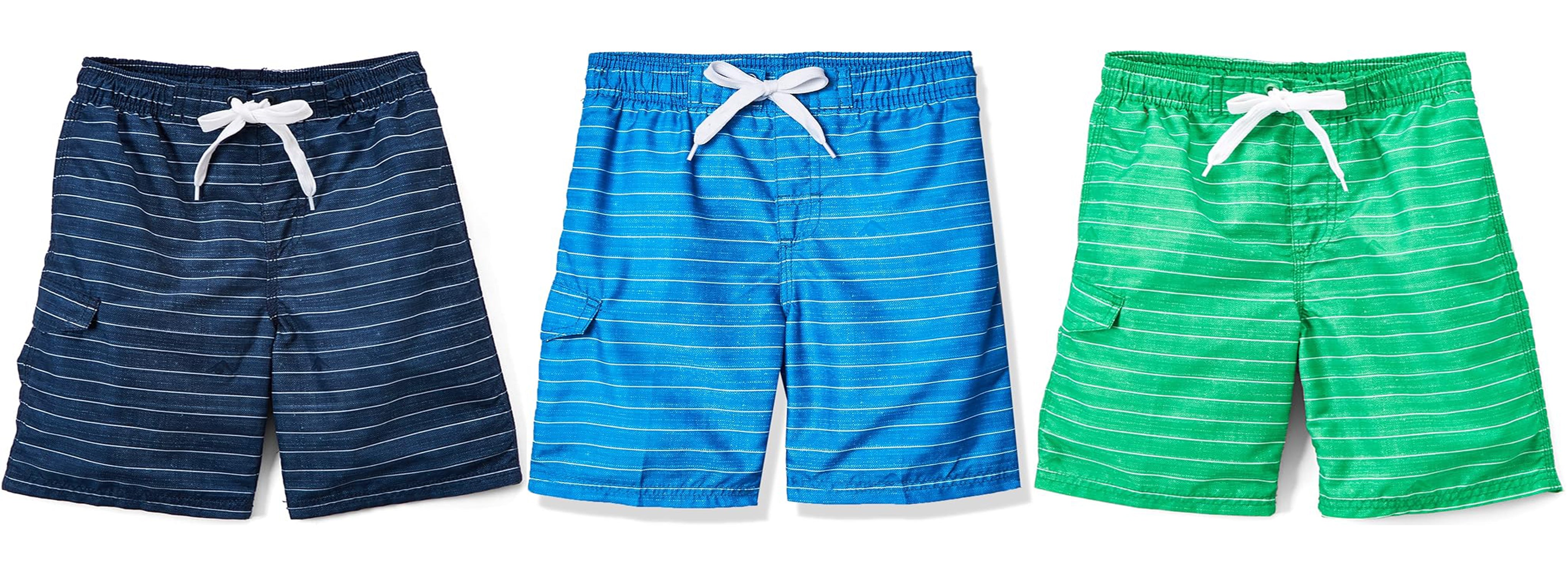 Wholesale little boy's striped swim trunk. Lightweight, quick-drying microfiber fabric with UPF 50+ protection. Comes in navy, royal blue, and green colorways. No grommets.