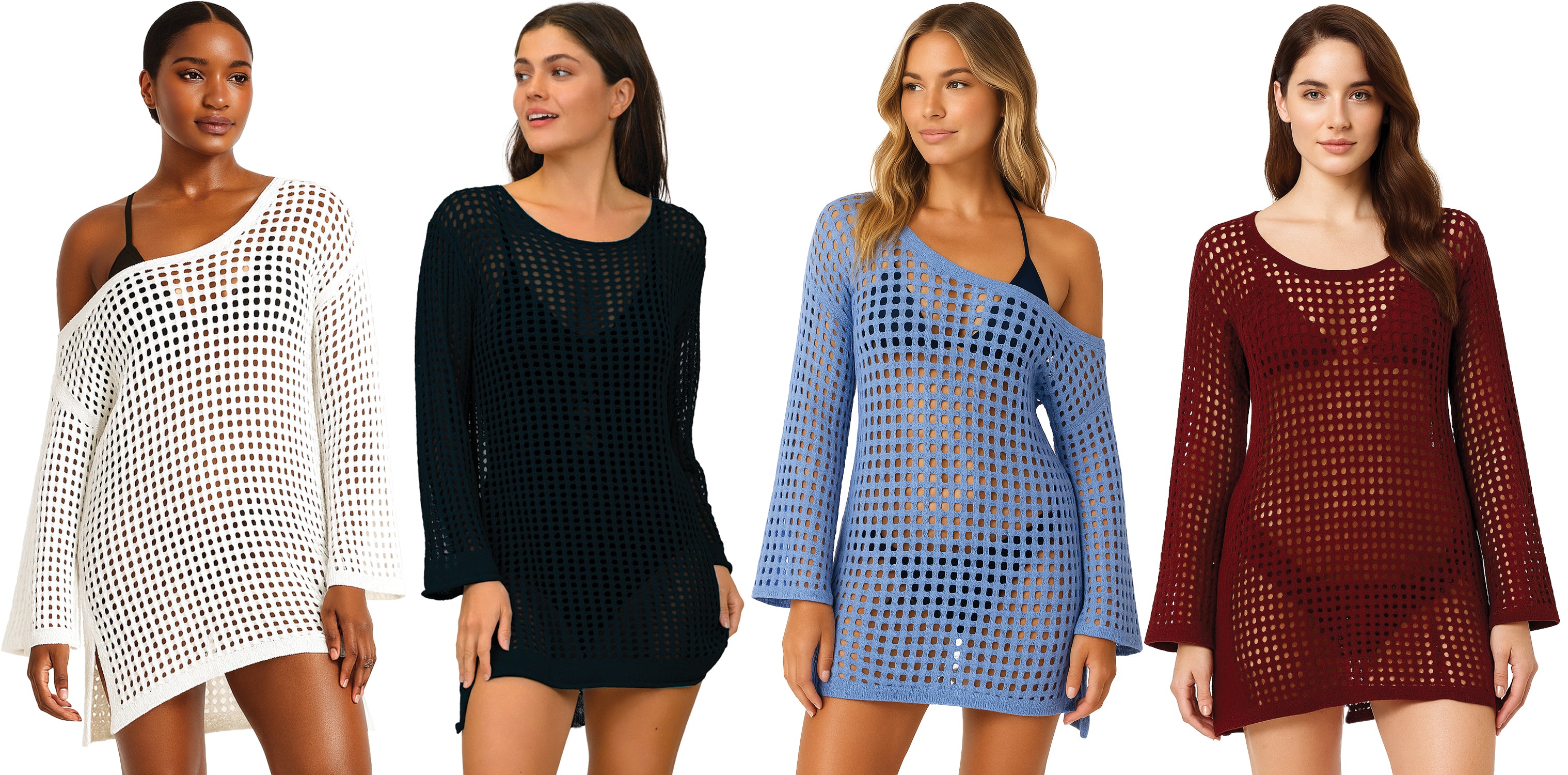 This women’s long sleeve crochet pullover cover-up blends beachy comfort with effortless style. Designed with a breathable open-knit pattern, it features a wide scoop neckline, side slits, and a relaxed fit that layers easily over any swimsuit. Lightweight and breezy, it’s perfect for poolside lounging or seaside strolls. Available in white, black, light blue, and burgundy. One size fits most.