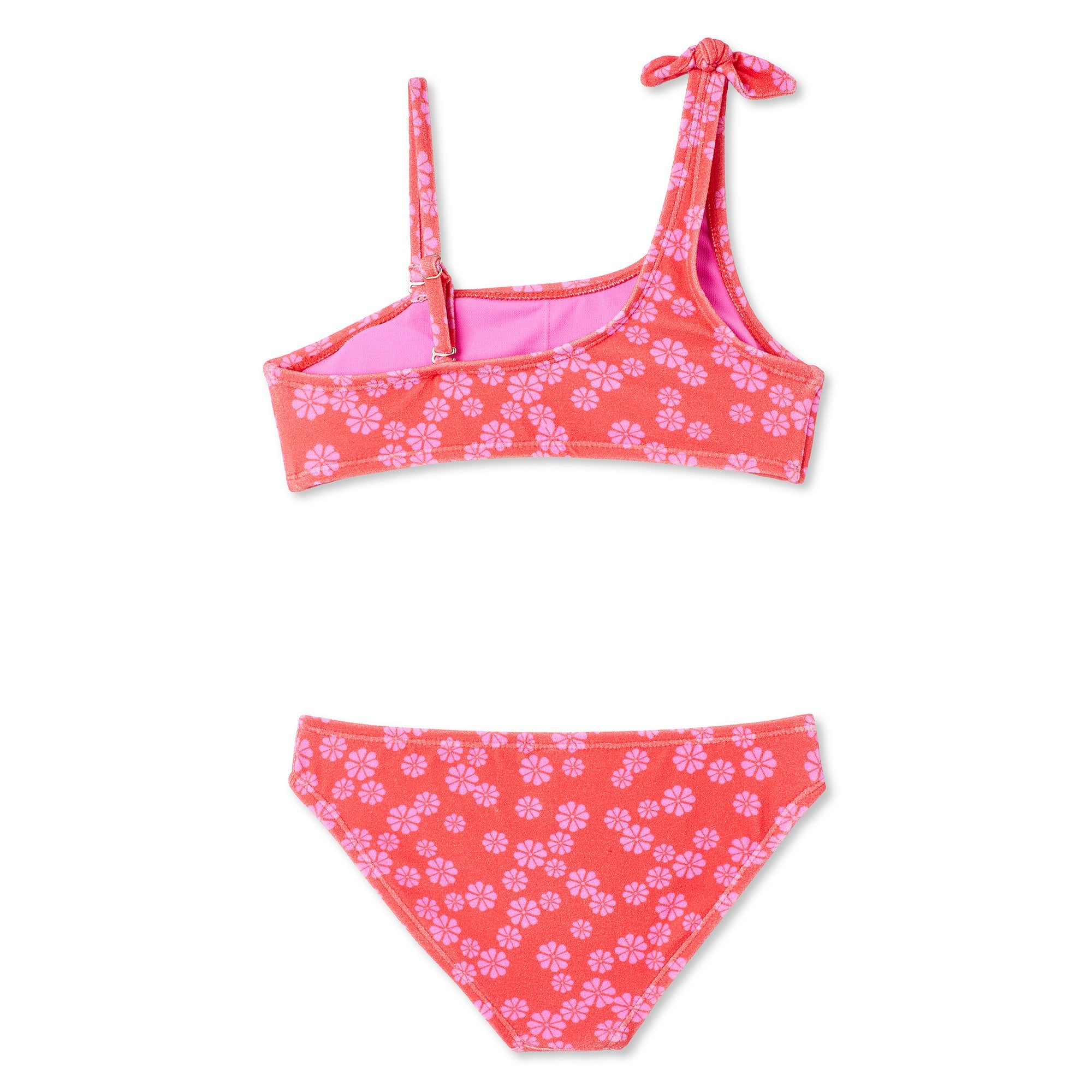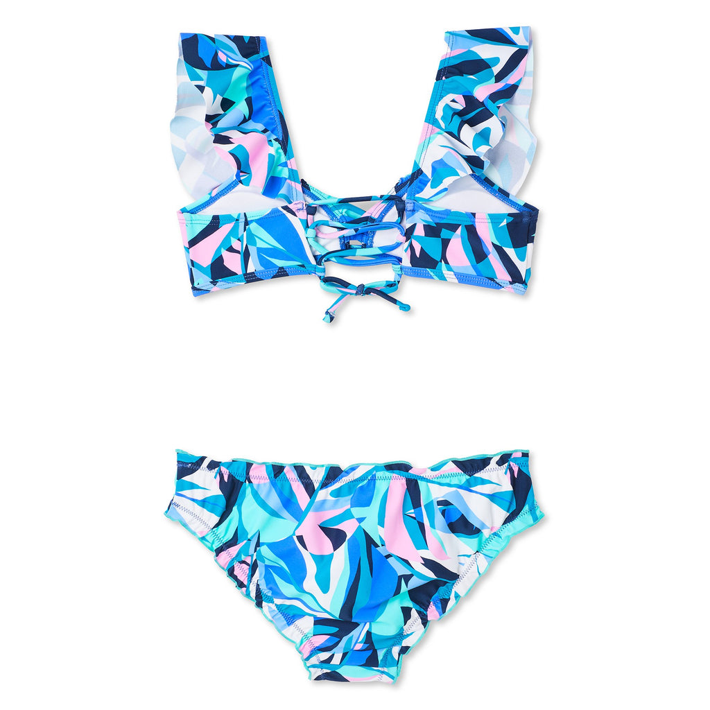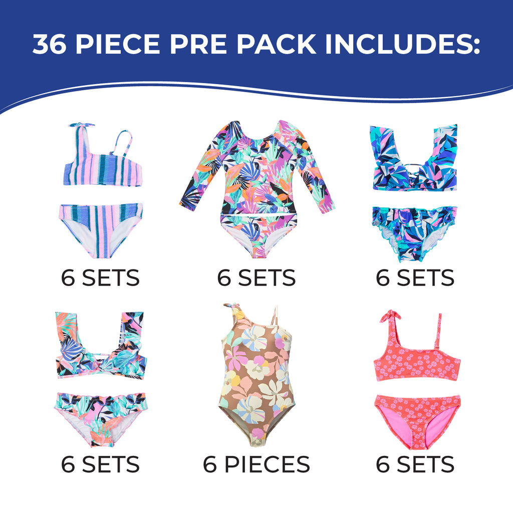 Wholesale girl's one-piece, two-piece, and rash guard two-piece swimsuit collection. Includes 1 one-piece, 4 two-pieces, and 1 rash guard two piece in a variety of prints and styles. Comes in sizes 7 - 16.
