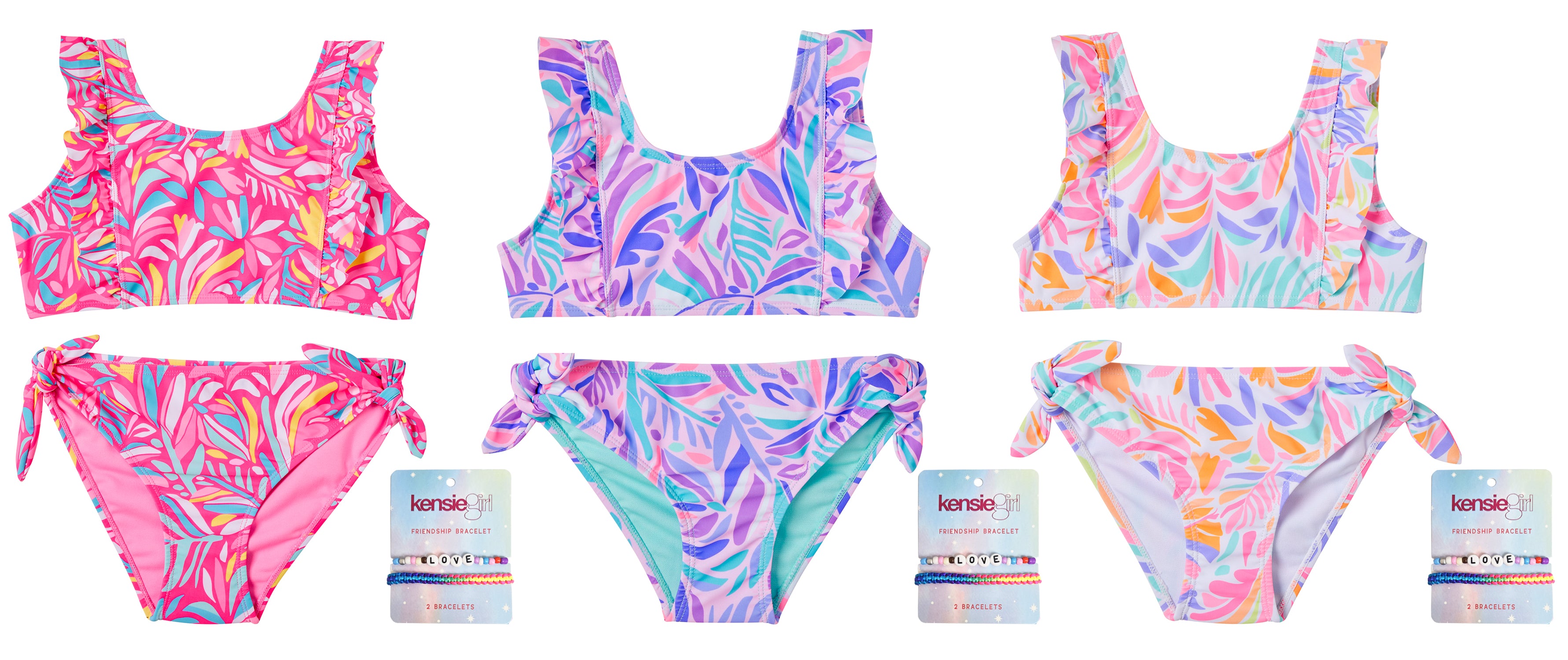 This bundle features one ruffled two-piece design available in three vibrant tropical prints: pink, purple, and white. Each swimsuit includes a paneled ruffled top, side bow detail on the bottoms, and two matching friendship bracelets.