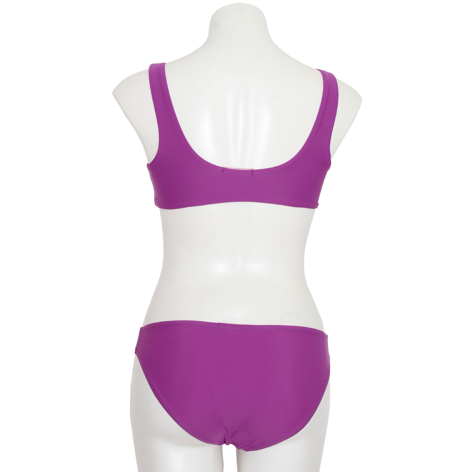 This junior's tie-front bikini is a must-have addition to your swimwear collection. Featuring an adjustable tie-front top for a customizable fit and matching solid bottoms with a cheeky cut, it offers both style and comfort. Made from 82% Nylon and 18% Elastane, this bikini provides a stretchy, durable fit with removable soft cups for extra support. Available in five vibrant colors—Black, navy, purple, coral, hot pink & bright teal—this bikini is sure to appeal to young customers. Each bundle includes 48 pieces with hangers for easy display, and it comes in sizes S-XL.