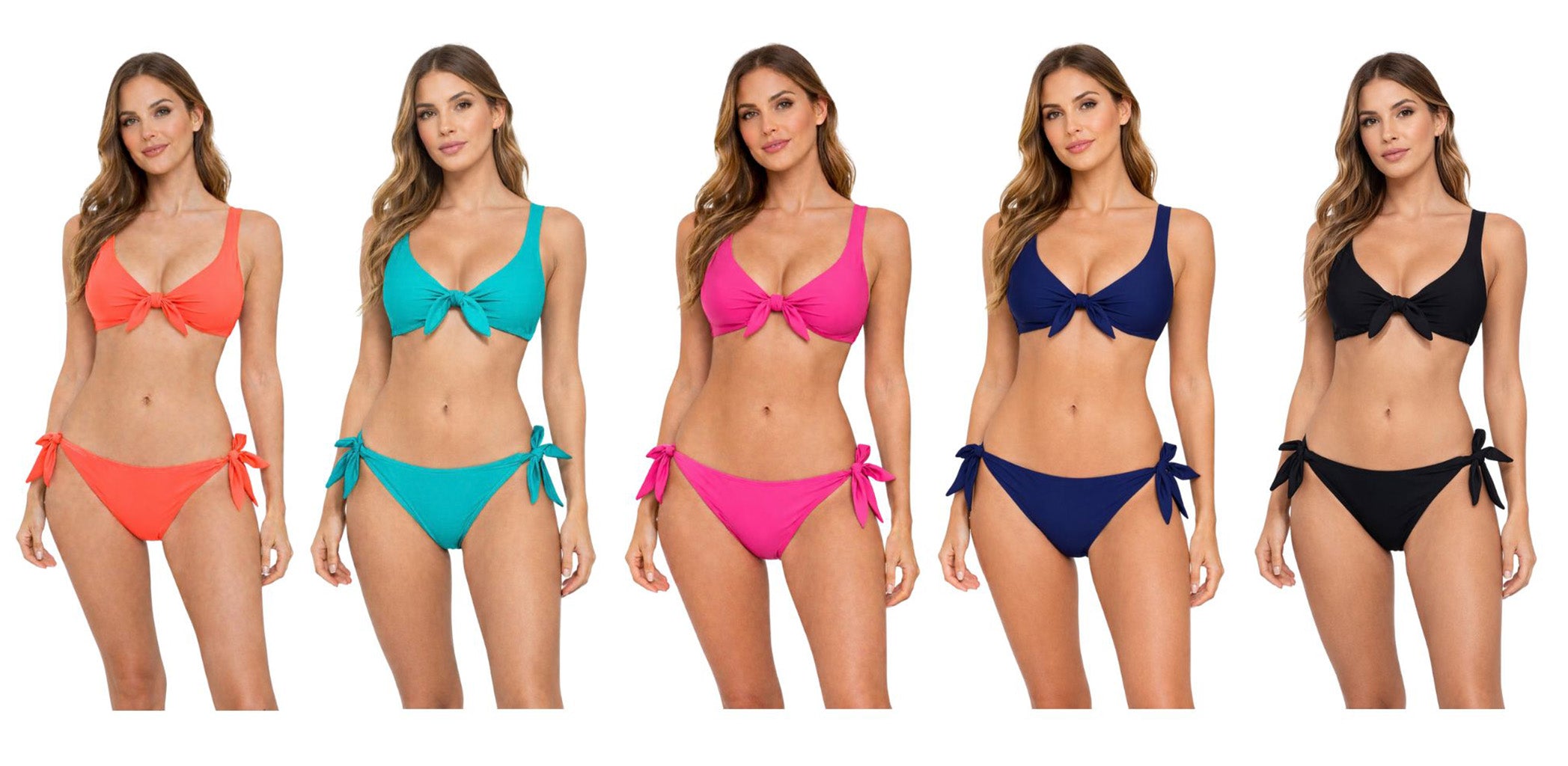 Yes! The junior's tie-front bikini comes in six vibrant colors: Black, navy, purple, coral, hot pink & bright teal. The set includes an adjustable tie-front top and matching solid classic cheeky-cut bottoms, offering a fun and customizable look.