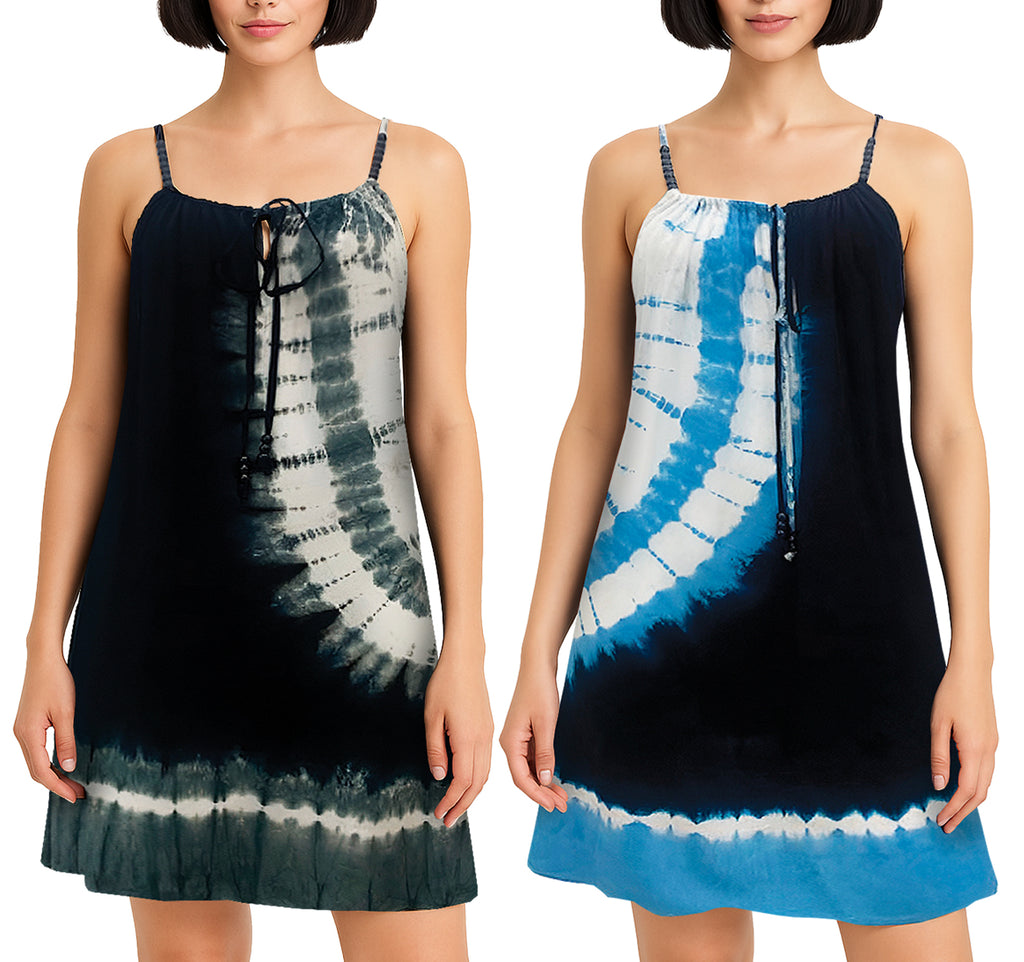 Add a splash of boho charm to your summer lineup with this wholesale women’s A-line tie-dye cover-up dress. Designed with a flattering square neckline, beaded adjustable straps, and a front tie detail, it’s the perfect blend of relaxed and stylish. The lightweight 100% rayon fabric flows beautifully, making it an easy go-to for beach days or resort lounging. Each pack includes 24 pieces in two eye-catching colorways: gray/black and blue/navy. Ideal for retailers looking to stock easy, breezy warm-weather staples.
