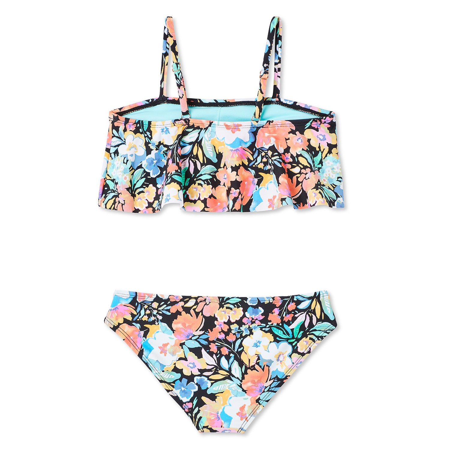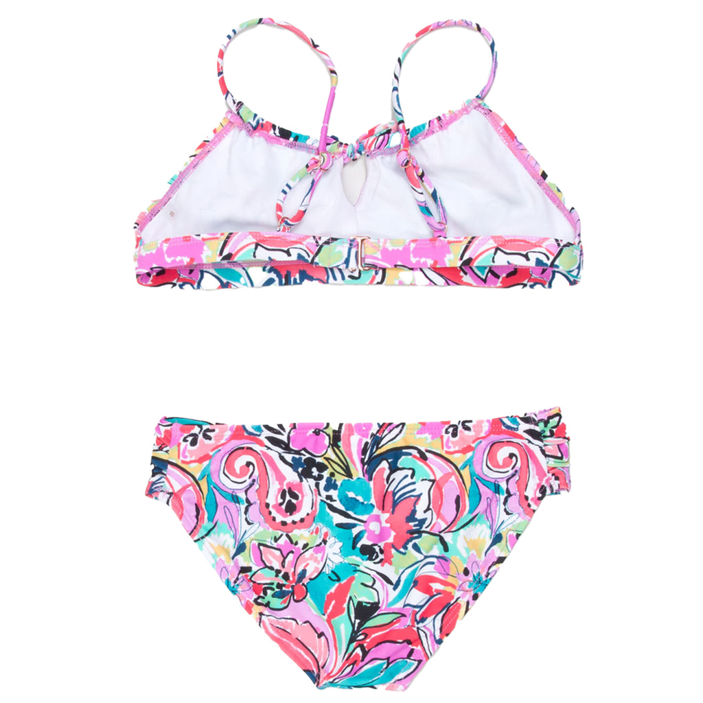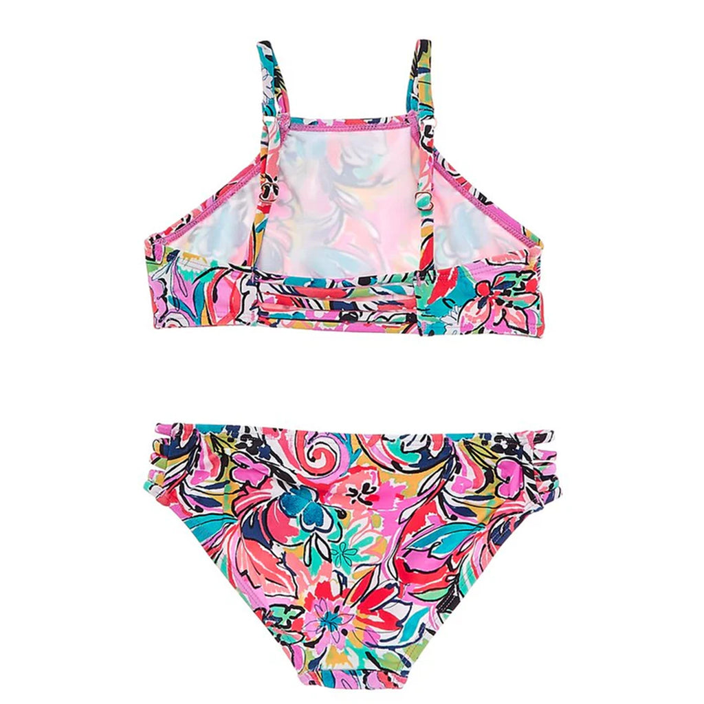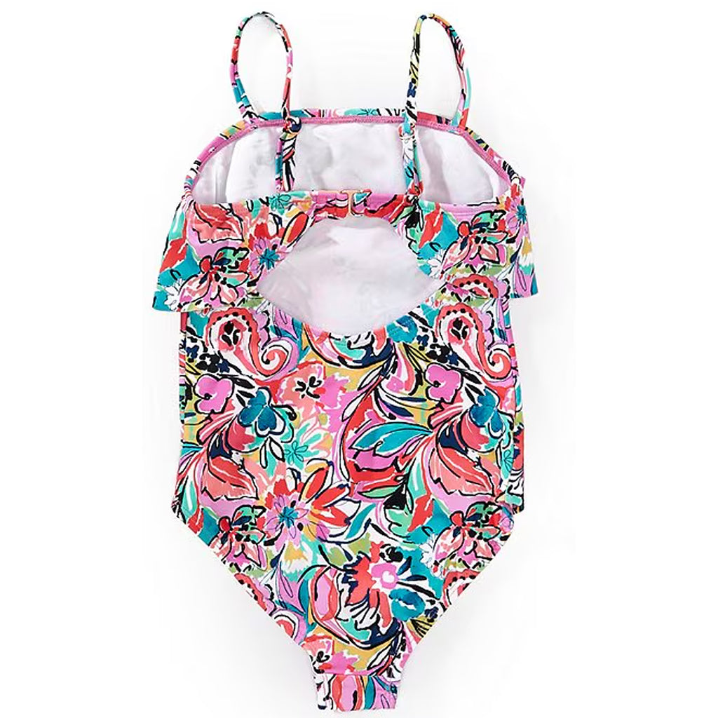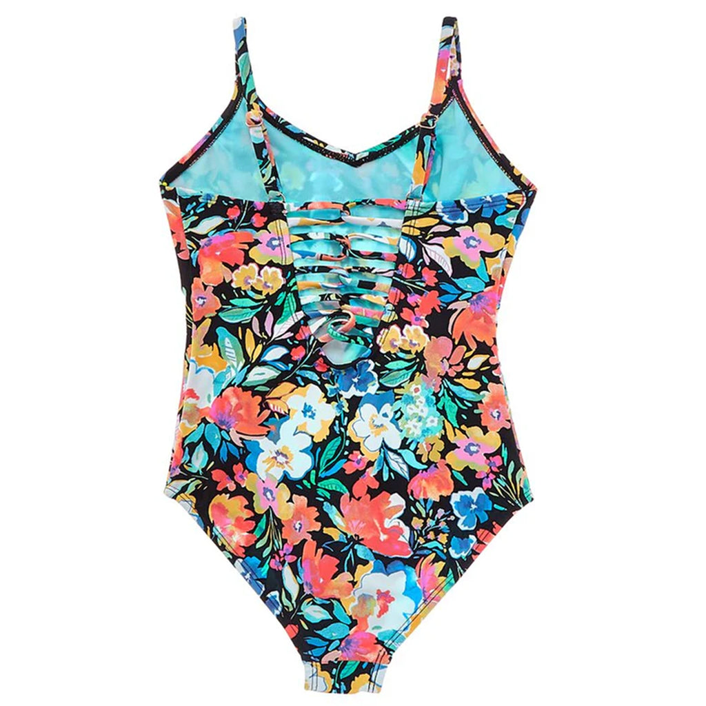 Wholesale girl's floral print one-piece and two-piece swimsuits. Includes 2 one-pieces and 4 two-pieces in 2 floral prints in a variety of different styles. SIZES WILL VARY.
