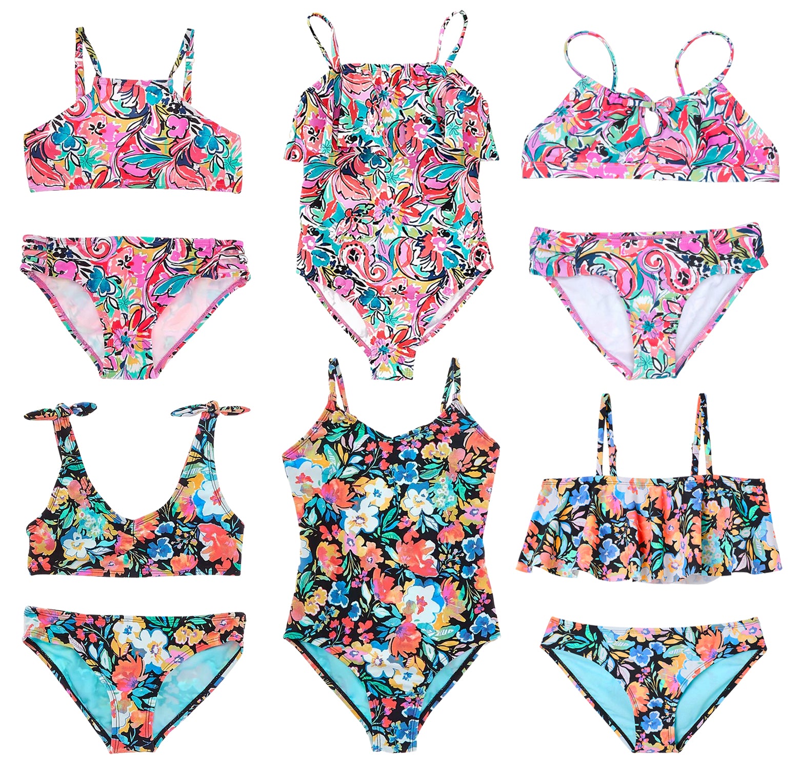 Yes, this collection includes 2 one-piece and 4 two-piece swimsuits in two floral prints: pink abstract floral and floral on black. Styles feature a variety of necklines such as high-neck, scoop, V-neck, and ruffled, along with bottom styles including classic, ruched sides, and multi-strap designs.