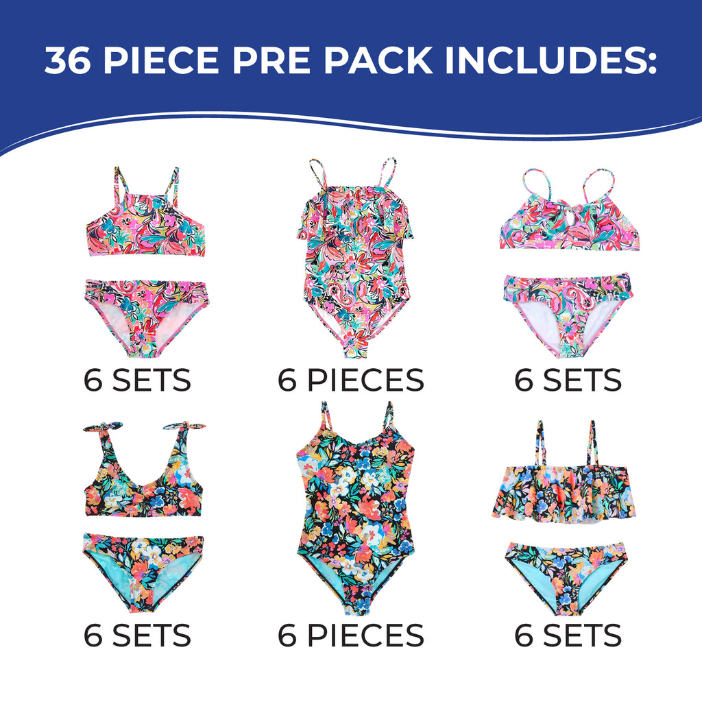 Freshen up your girls’ swimwear lineup with this charming collection of floral one-piece and two-piece swimsuits. Each 36-piece pack includes 2 one-pieces and 4 two-piece sets in two stylish floral prints—one vibrant pink abstract and one classic black with florals. Featuring a mix of necklines like high-neck, scoop, ruffled, and V-neck, these suits offer full coverage and standout details like ruched sides, keyholes, bows, and multi-strap backs. Made from a comfortable, stretchy nylon-spandex blend, they’re designed for both style and movement.