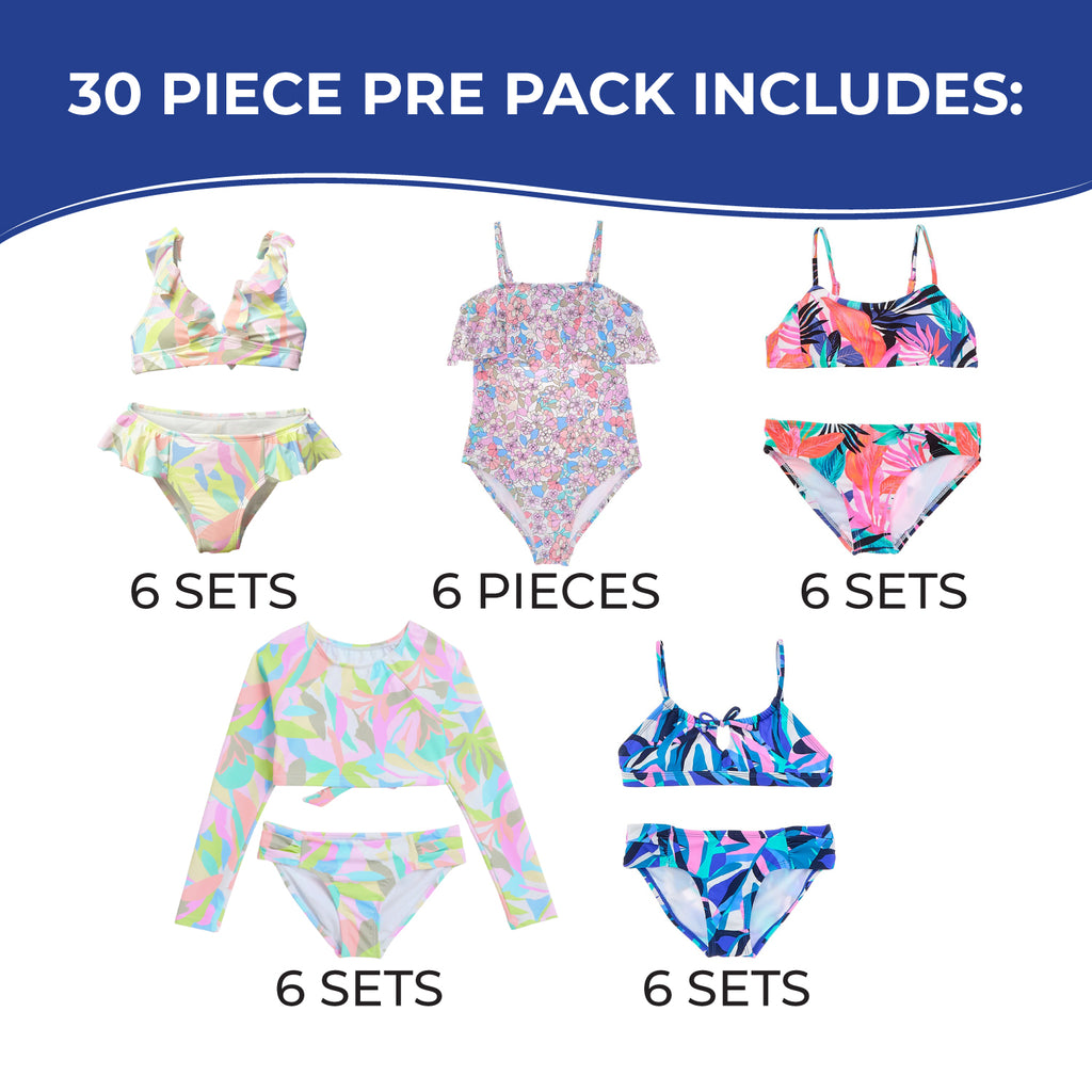 Bright, bold, and beach-ready—this girl's swimwear collection offers a mix of stylish silhouettes and playful prints perfect for summer. Each 30-piece pack includes 1 one-piece, 3 two-pieces, and 1 rash guard set in a variety of vibrant designs like abstract tropical leaves, micro-florals, and blue abstract patterns. Styles feature full coverage and fun details like ruffled necklines, ruched sides, keyholes, and open backs, with select suits offering adjustable straps for a flexible fit. Made from a comfortable nylon-spandex blend, these suits are built for both fashion and function. Please note: the tropical leaf print on white two-piece style does not include size 10.