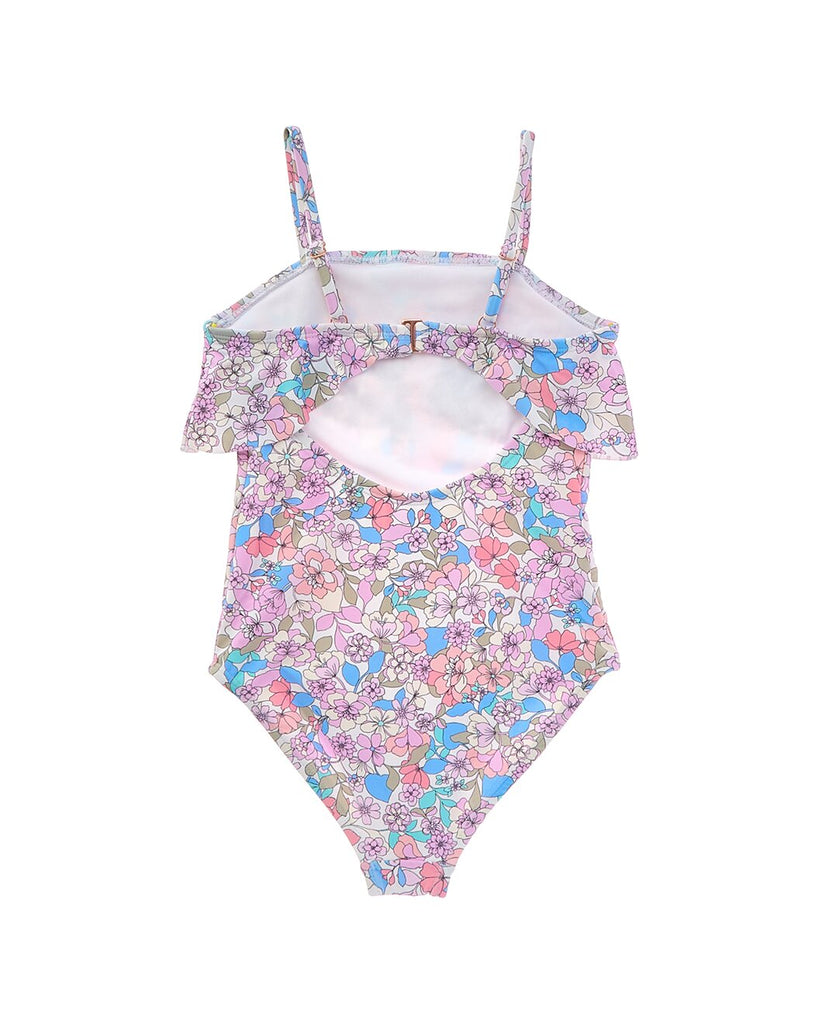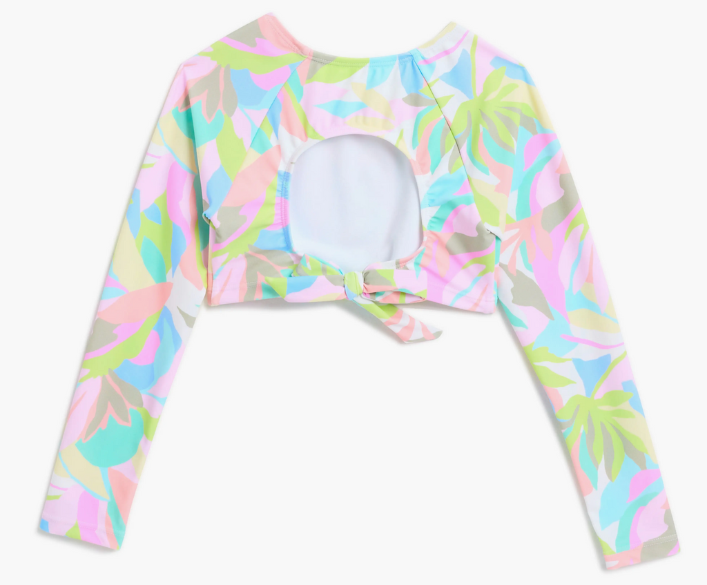 Wholesale girl's printed one-piece, two-piece, and rash guard two-piece swimsuit collection. Includes 1 one-piece, 3 two-pieces, and 1 rash guard two-piece in a variety of prints and styles. Comes in sizes 7 - 16. Tropical leaf print on white two-piece style has no size 10.