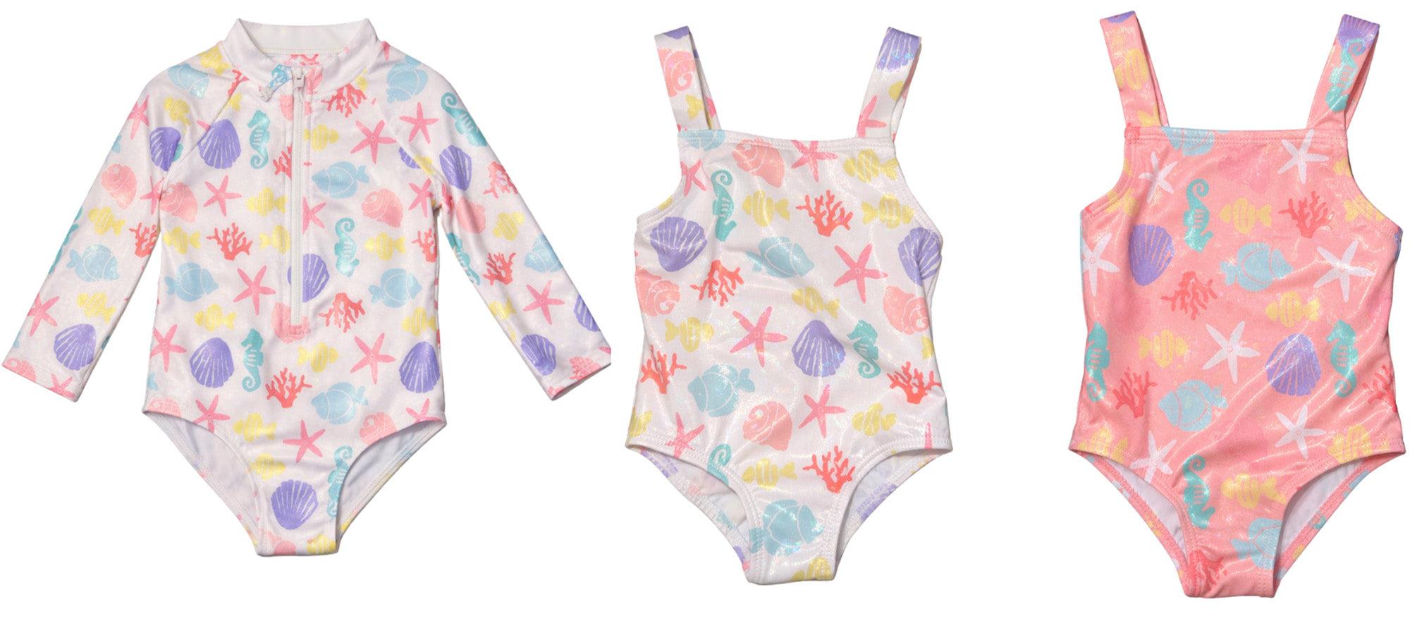 Yes, this assortment includes two one-piece swimsuits and one coordinating rash guard in white and pink metallic seashell colorways. The cohesive design and shimmering details create a coordinated and eye-catching retail presentation.