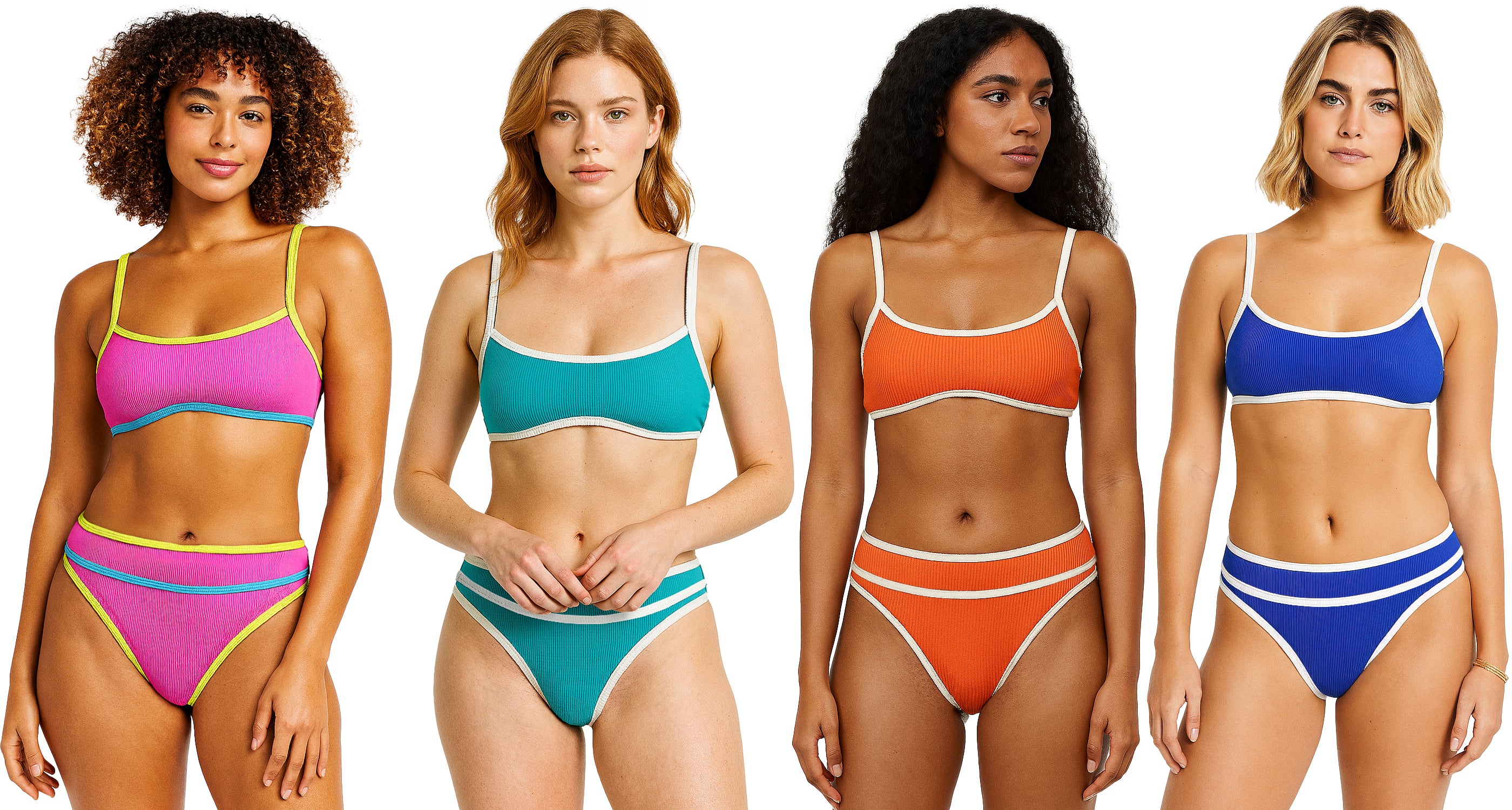 Wholesale Junior Color Blocked Ribbed 2 Piece Bikini Scoop Top Adjustable Straps, Removable Cups and Mid Waist Bottoms