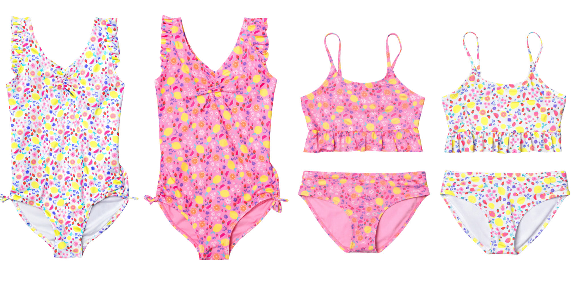 Wholesale Girl’s Swimwear Includes 2 Ruffle Tankinis and 2 Ruffle One-Pieces in White and Pink colorways with Fruit and Flowers. Features a cinched V-neck, side ruching comes in sizes 7/8-10/12-14/16. UPF 50+ protection. Hangers included.