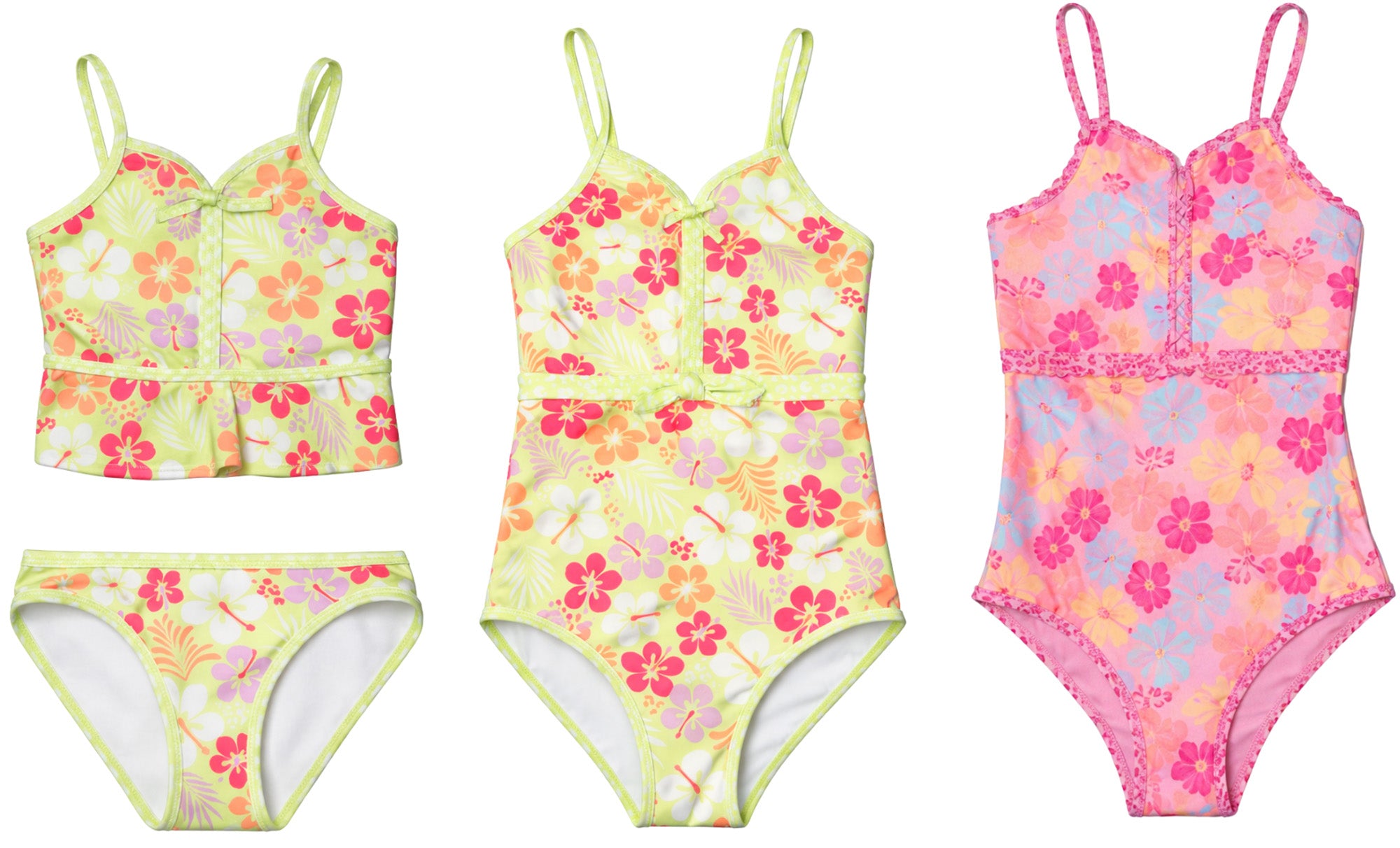 Yes, this pack includes one tankini and two one-piece silhouettes featuring bow and ruffle details. The assortment is offered in pink and green floral cheetah print colorways, creating a coordinated yet eye-catching retail presentation.