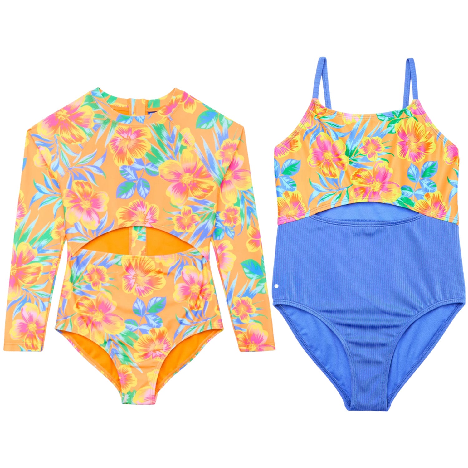 Yes, this pack includes two coordinated styles: a blue ribbed one-piece with a tropical print top and center cut-out detail, and a long sleeve rash guard one-piece with a zip-up back. Both feature vibrant tropical colors designed for eye-catching retail displays.