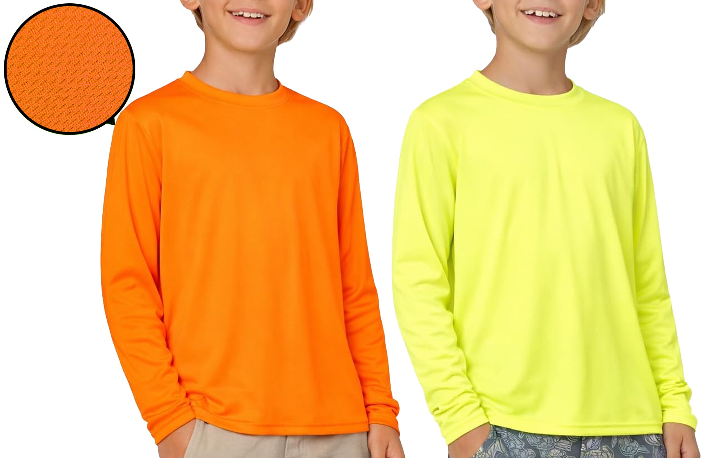 Wholesale Boy's Solid Long Sleeve Rash Guard. Relaxed fit, breathable, quick-drying material. Comes in neon orange & neon yellow. UPF 50+ protection. Comes in sizes XS-XL