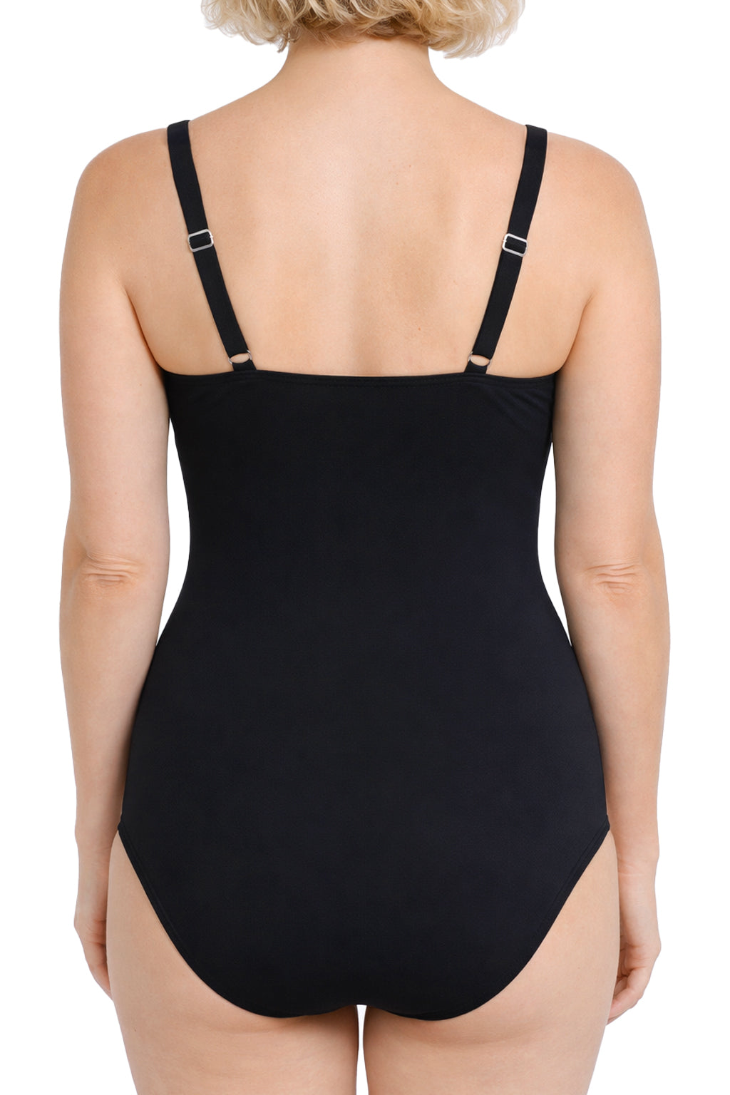 Wholesale women's solid black surplice knot detail one-piece swimsuit. Features soft-feel fabric with a surplice wrap front and knot detail on side. Comes in sizes 8 - 16.