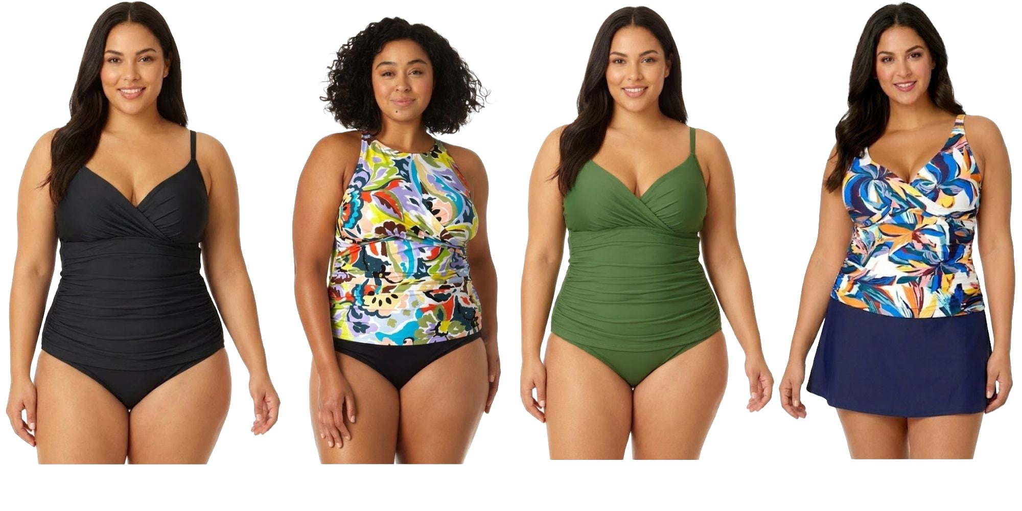 Wholesale Women’s Plus Skirtini & Tankinis. Some styles feature underwire, soft removable cups, back hook closure; includes a surplice neckline and a halter option, with adjustable straps. Comes with matching black bottom briefs that are convertible in 3 ways, some with tummy control. Available in Moss, Black, and prints “Riviera Floral” and “Kashmir Paisley”.