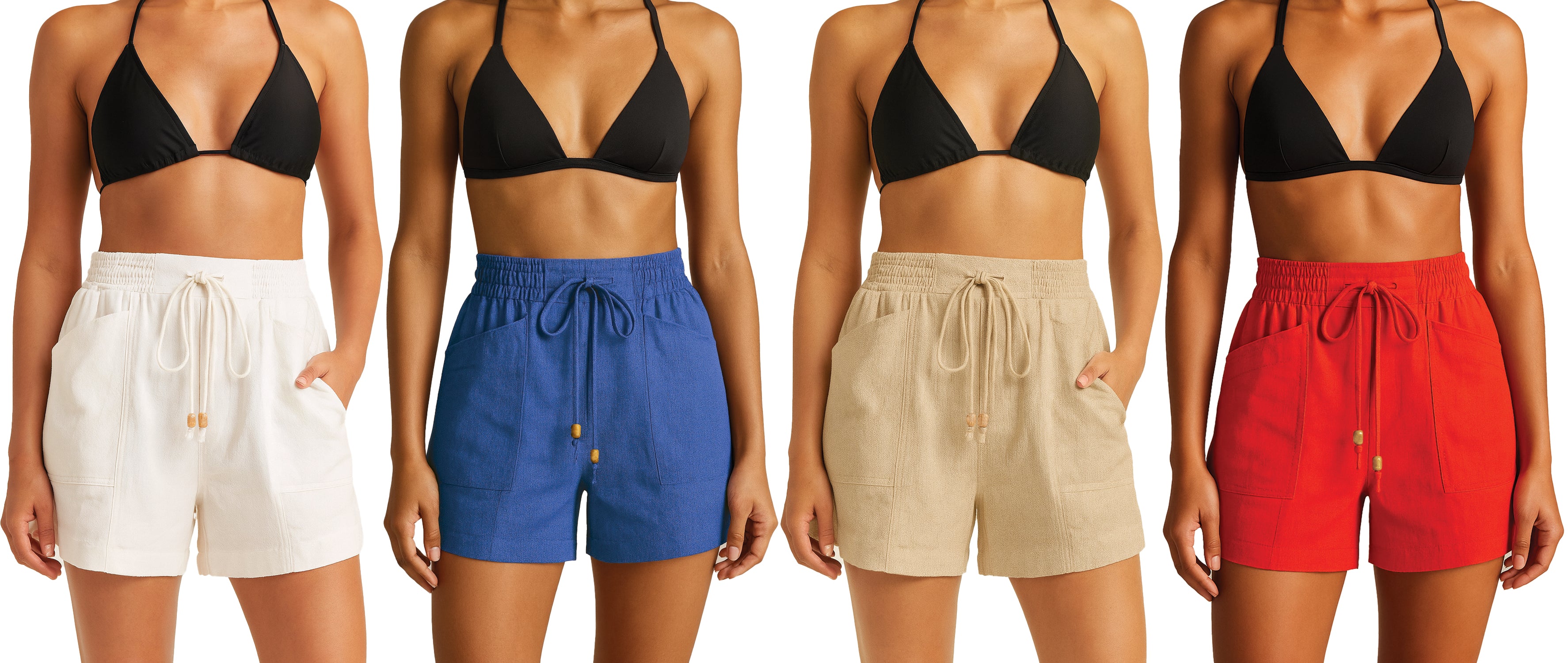 Add a splash of color to your summer collection with these wholesale women's solid linen shorts featuring a beaded drawstring detail. Made from a lightweight and breathable rayon blend, these shorts offer a comfortable elastic waist and two functional side pockets. The decorative beads on the drawstring add a subtle, stylish touch. Available in white, azure blue, khaki, and red in sizes S–XL. Sold in 24 or 48 piece prepacks.