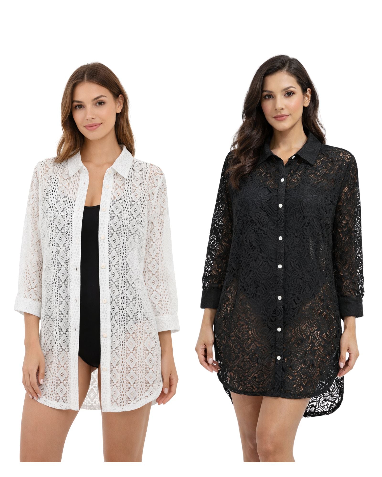 Yes, this style is available in two sophisticated colorways: black with intricate ornate damask crochet and white with geometric crochet-style lace. Both feature a collared neckline, button-front closure, long sleeves with button cuffs, and a relaxed high-low hemline.