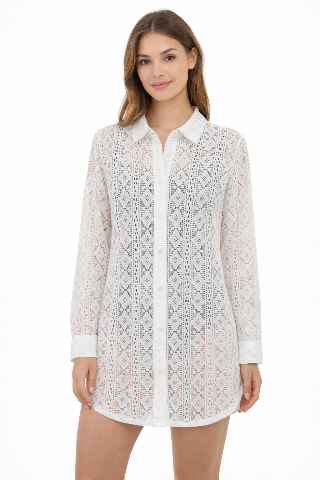 Elevate your resort collection with this Women’s Classic Button-Down Cover Up, designed for effortless sophistication by the water. Available in black ornate damask crochet and white geometric crochet-style lace, this sheer, lightweight layer adds texture and elegance to any swim look. The collared neckline, functional button-front placket, and long sleeves with button cuffs create a polished silhouette, while the relaxed high-low hemline offers breathable coverage. Crafted from airy 100% polyester, it’s perfect for layering over swimwear from beachside lounging to sunset strolls. Offered in sizes XS–XL, this versatile cover-up is a refined staple for any warm-weather assortment.
