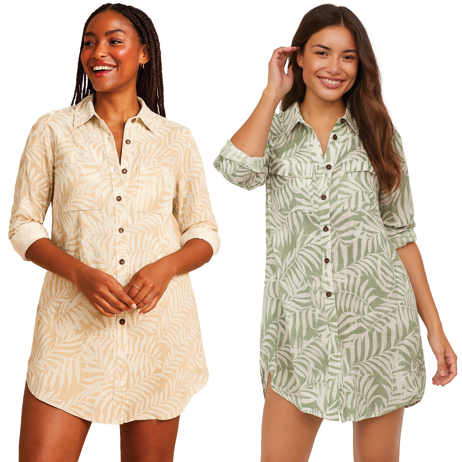 Wholesale Women’s Lightweight Dress. Features Button-Up Front, Pointed Collar, 2 Front Pockets, and Long Sleeves. Comes in Prints “Sand Palm” and “Sage Palm”. Designed with a curved hemline that works beautifully as a standalone dress or a layered swimwear cover-up.