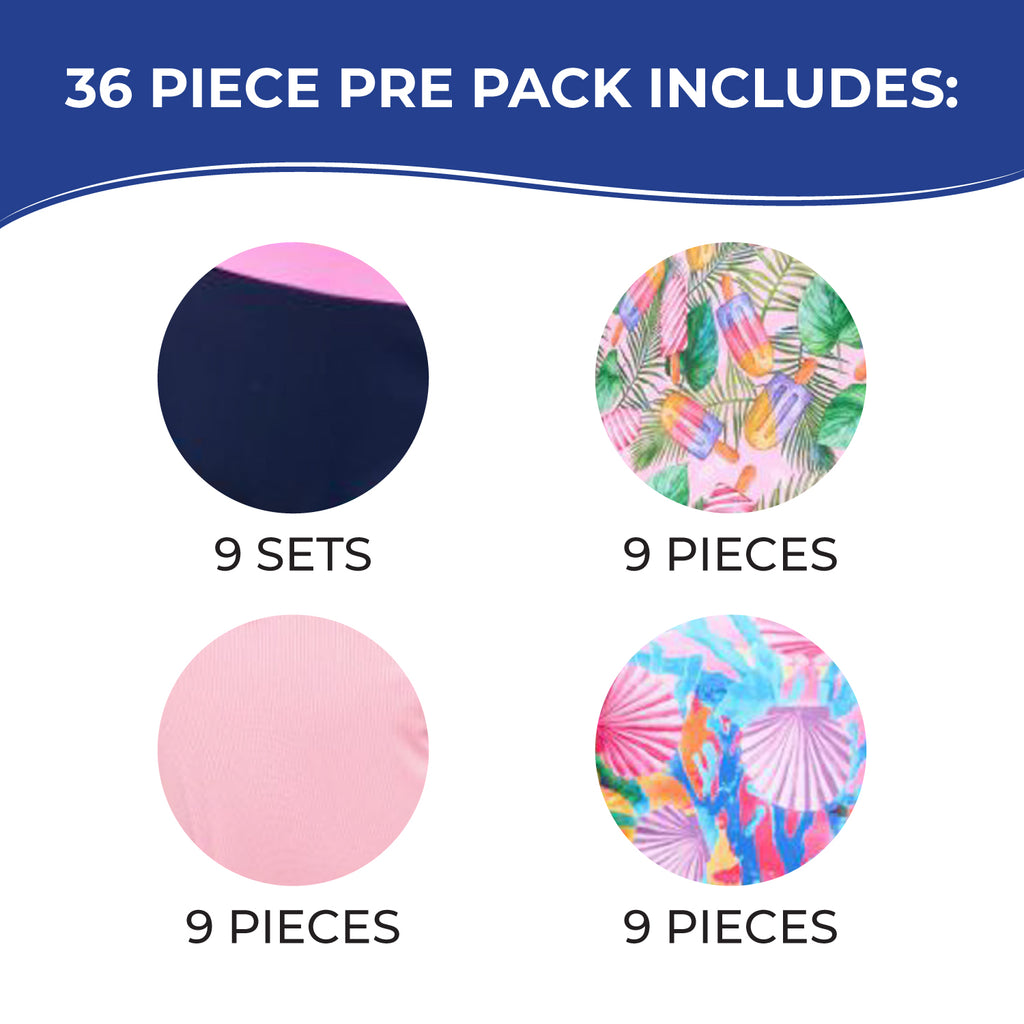 There is no minimum order quantity required. This girl’s one-piece and two-piece swimsuit collection is sold in 36-piece prepacks, and you may order as few as one prepack.