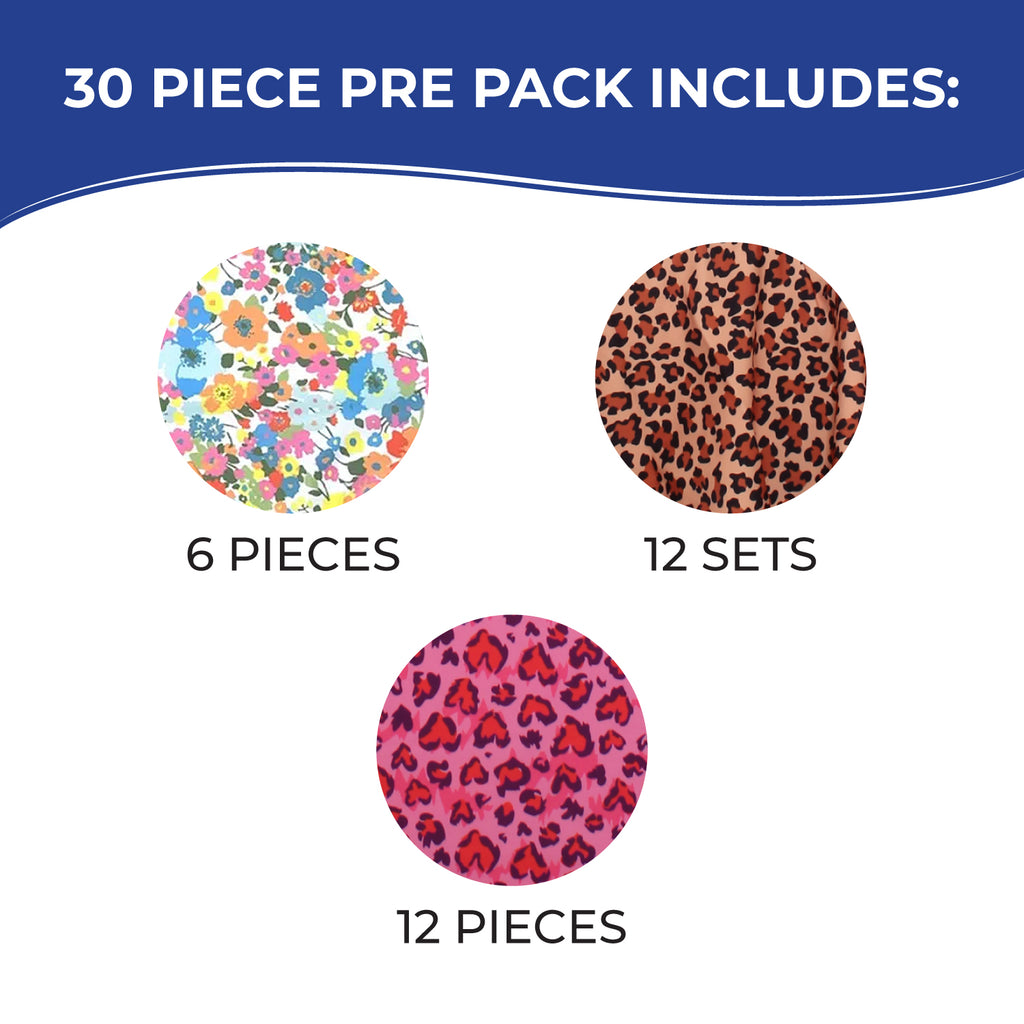 Add sweet, standout style to your girls' swimwear lineup with this ruffled one-piece and two-piece swimsuit collection. Each 30-piece pack includes a mix of styles featuring charming ruffle details at the front or neckline, along with adjustable straps for a secure fit. Necklines vary between V-neck, scoop, and square, with playful touches like cross-back straps and bow accents. Made from a soft, stretchy polyester-spandex blend, these suits provide full coverage and comfort. Available in three fun prints: “Ditsy Floral,” “Flower Heart Cheetah,” and “Caramel Cutie Cheetah,” in sizes 7/8 to 14/16.