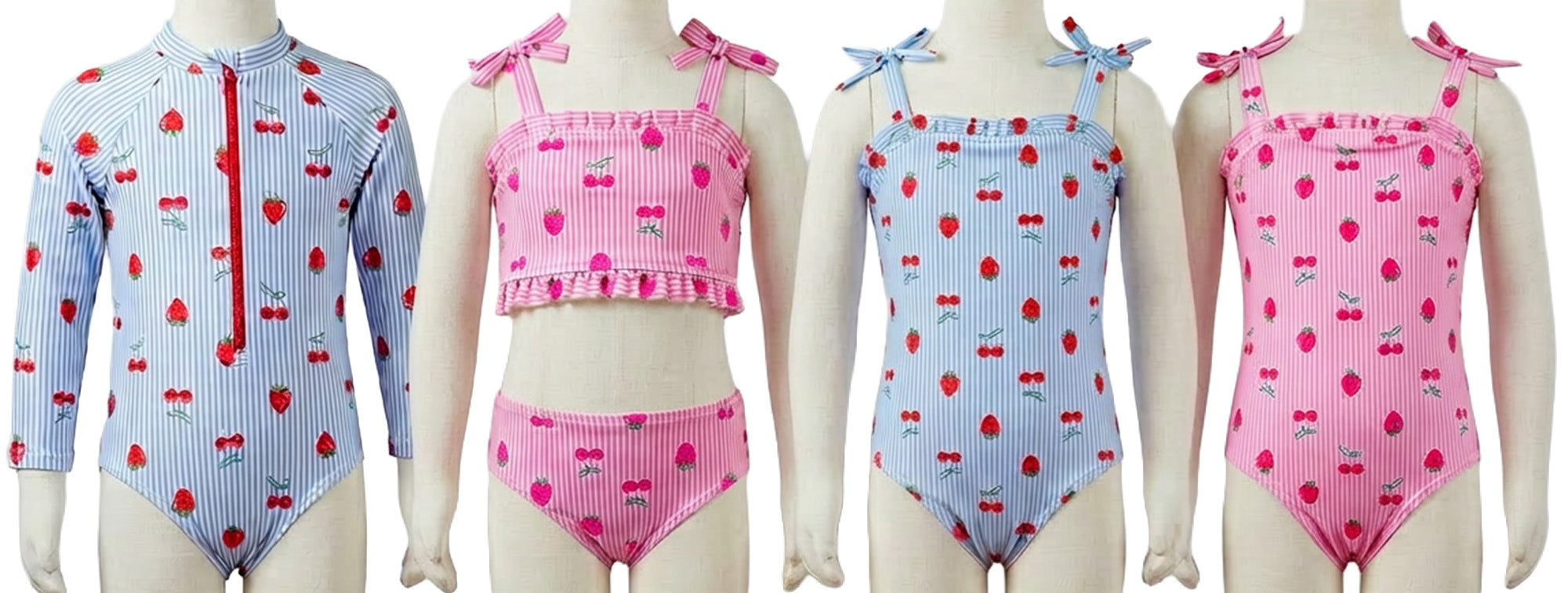 Wholesale Little Girl’s Striped Swimsuits with Fruit Print. Including 2 One-Pieces, 1 One-Piece and 1 Long Sleeved Rash guard. Features Ruffle and Bow detail. Comes in Pink and Blue colorways. UPF 50+ protection, HANGERS INCLUDED.