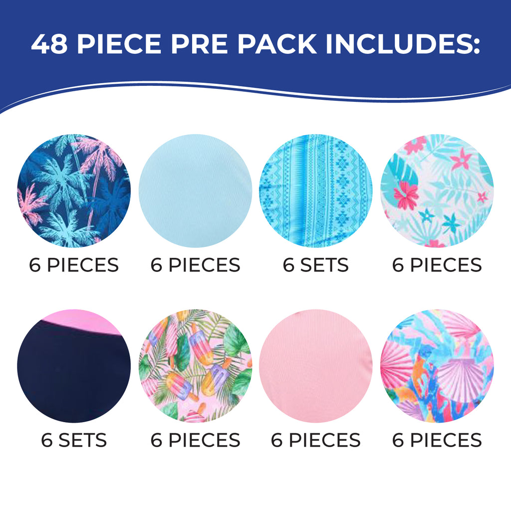 Add playful charm to your little girls' swimwear offering with this colorful collection of one-piece and two-piece swimsuits. Each 48-piece pack includes 6 one-pieces and 2 two-pieces in a variety of styles, featuring asymmetrical, V-neck, and scoop necklines with full coverage fits. Fun design details like bow accents, keyhole tie-fronts, textured fabric, and adjustable straps make each suit unique and eye-catching. Made from a soft and stretchy polyester-spandex blend, these suits come in vibrant prints and colors including “Miami Nice,” ocean blue, “Blue Aztec,” “Happy Hues,” navy color block, “Popsicle Party,” flamingo pink, and “You Had Me At Shell-O.” Available in sizes 4 to 6.