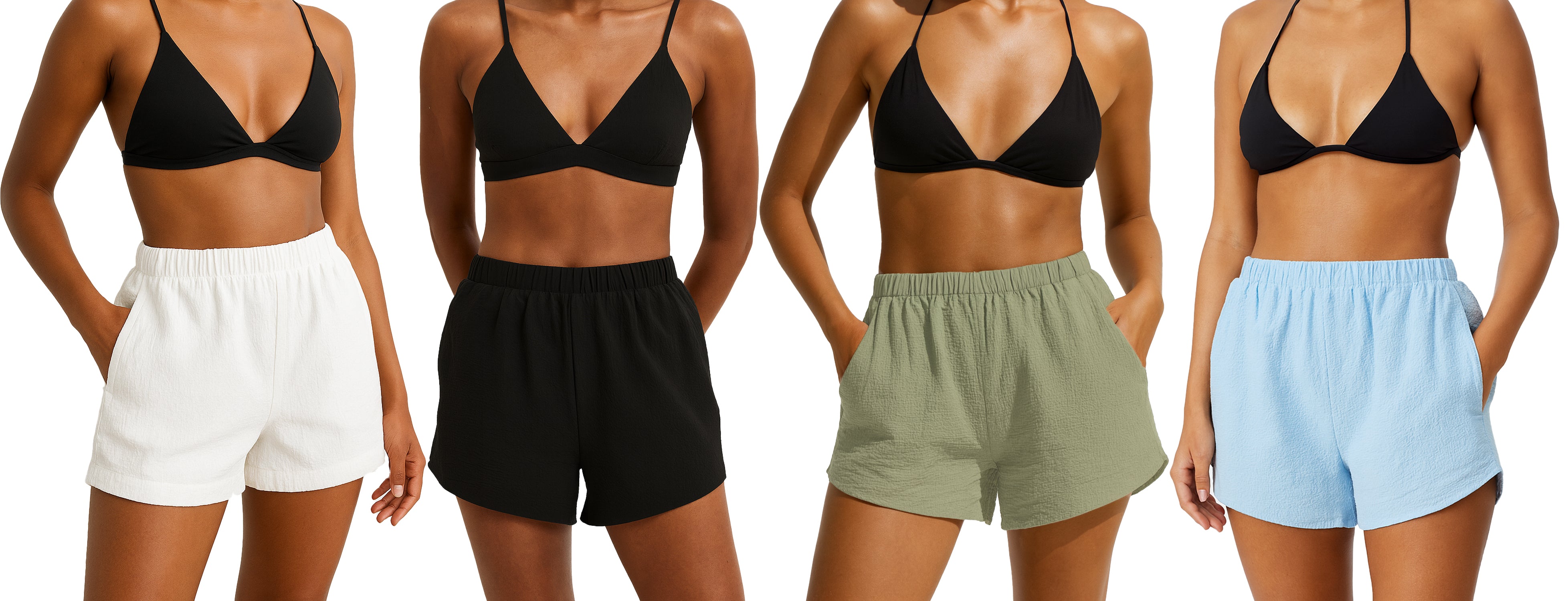 Yes, these shorts come in four solid color options: white, black, sage green, and baby blue. They feature an elastic waistband, two side pockets, and no grommets for a clean finish.