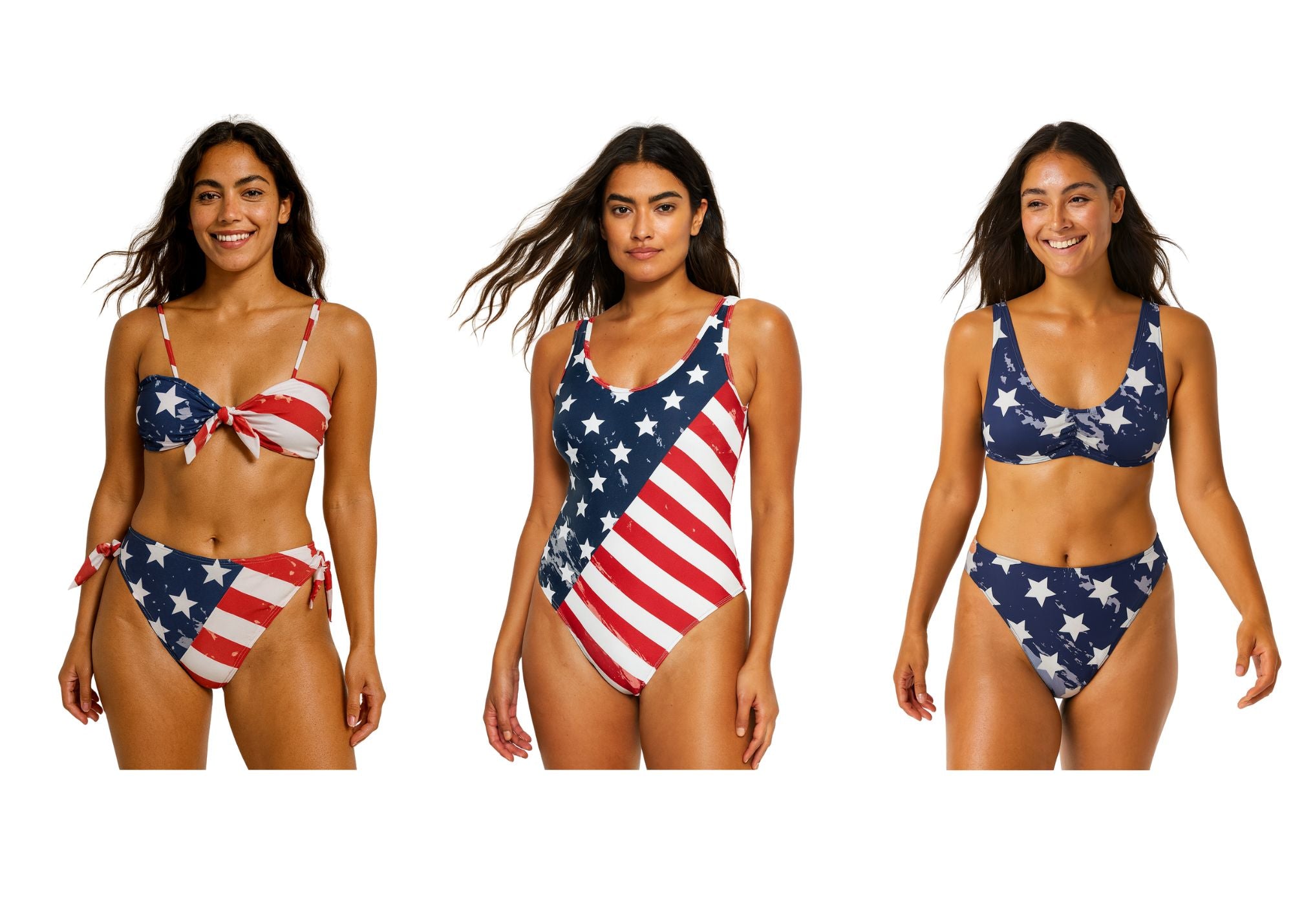 Yes, this pack offers strong variety for merchandising, including a sporty one-piece, a sport top with wave rider bottoms, and a bandeau top with removable straps paired with classic brief bottoms. All pieces feature a bold American flag print, making them ideal for patriotic, holiday, and summer-themed displays.