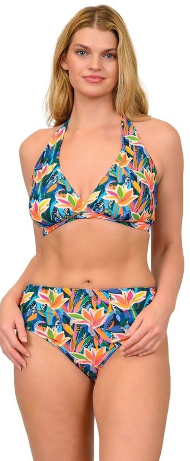 Wholesale women's halter two-piece set. Comes in 1 vibrant island time print sizes S - XL.