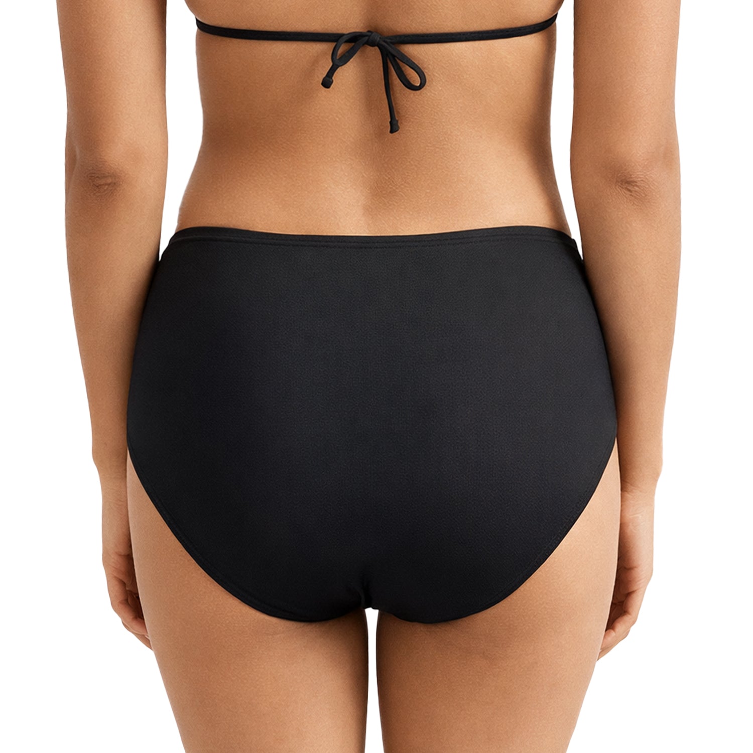 Wholesale women's solid black brief bottom. High-waisted swim bottoms with ruching on sides and UPF 50+ protection. Comes in sizes S - XXL.