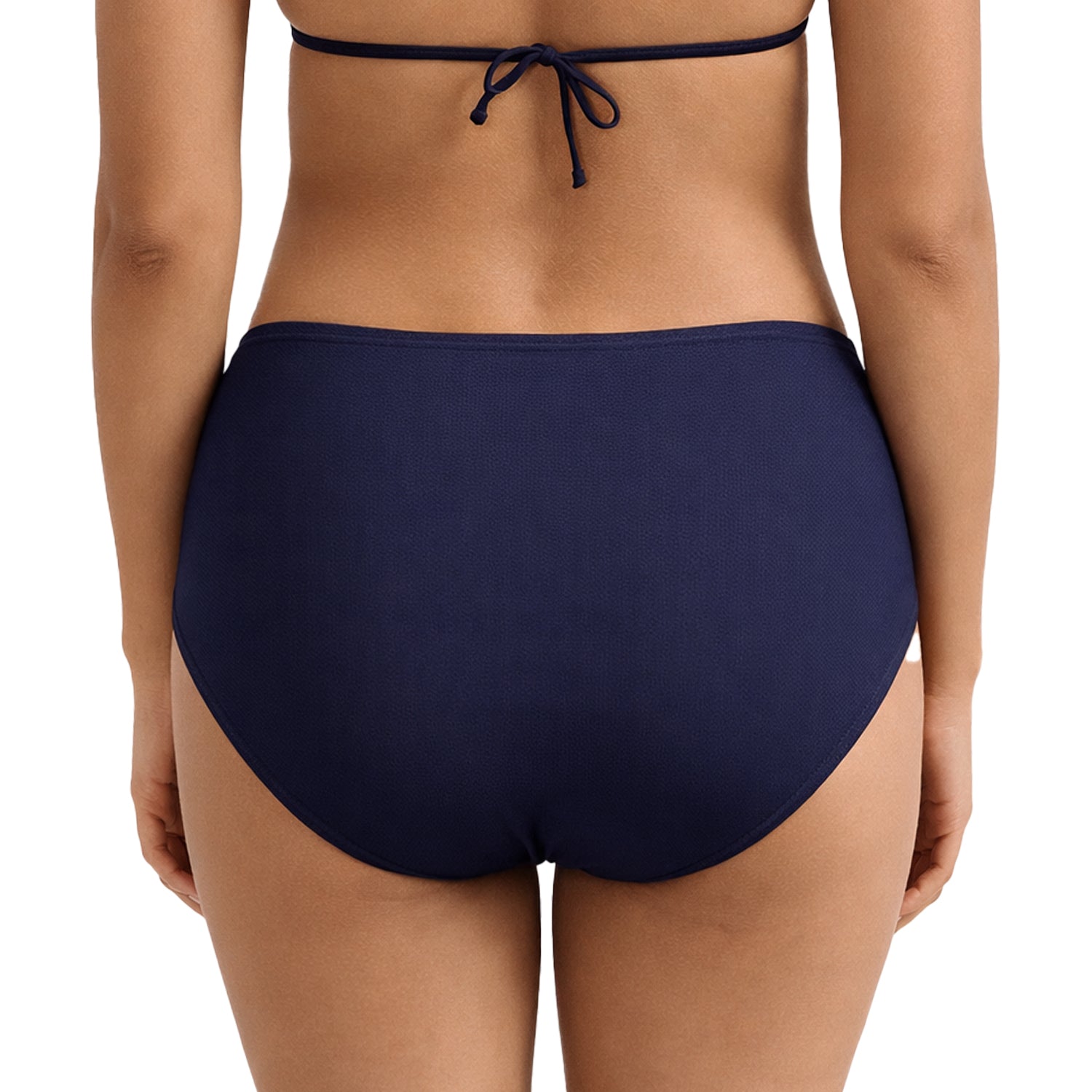 Wholesale women's solid navy brief bottom. High-waisted swim bottoms with ruching on sides and UPF 50+ protection. Comes in sizes S - XXL.