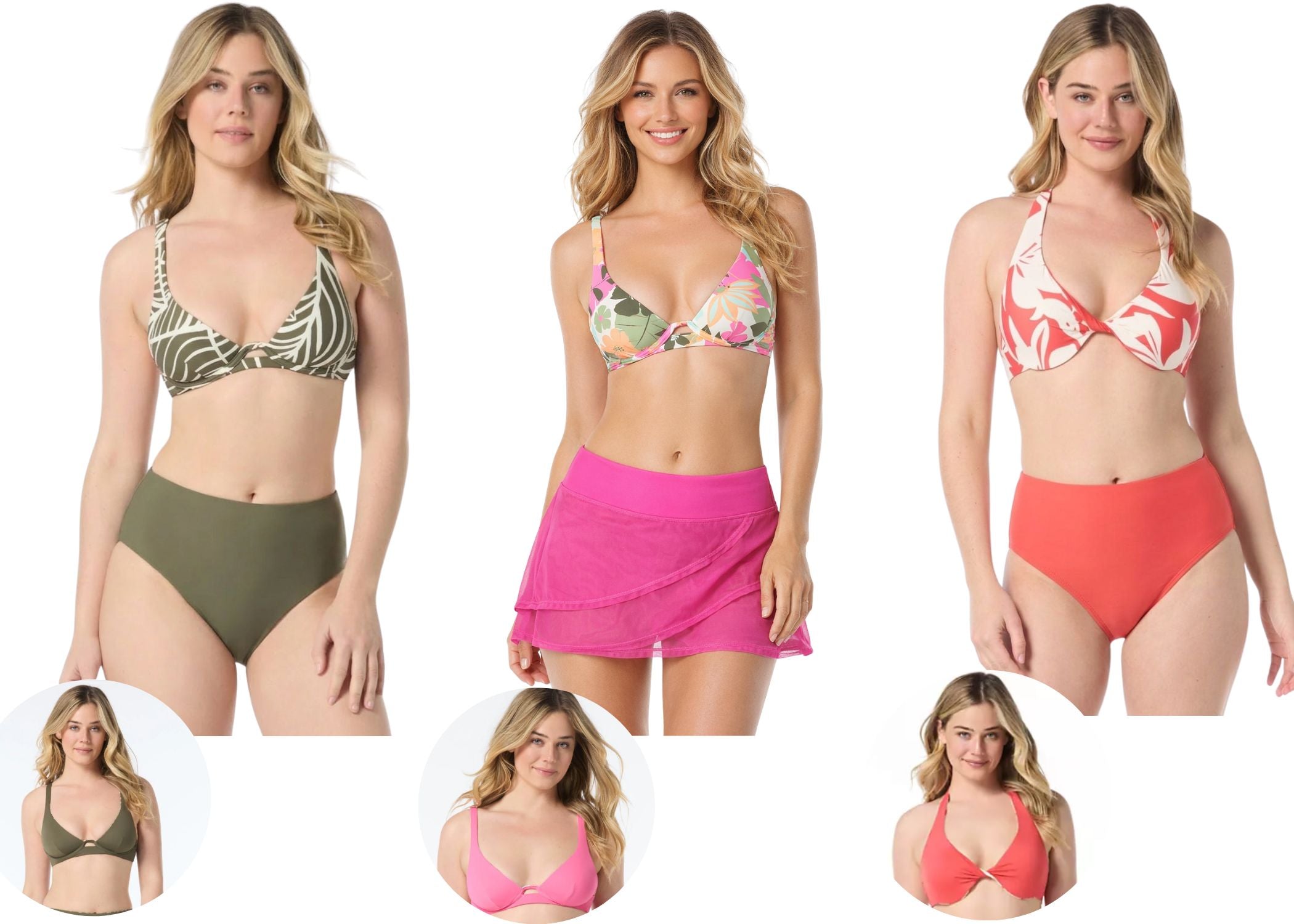 Yes, this assortment includes reversible underwire tops paired with either high-waist briefs or a layered mesh skirt. It is available in Palms Print, Tropical Coral, and Multi Color Floral, offering a mix of bold, resort-inspired looks for diverse merchandising.