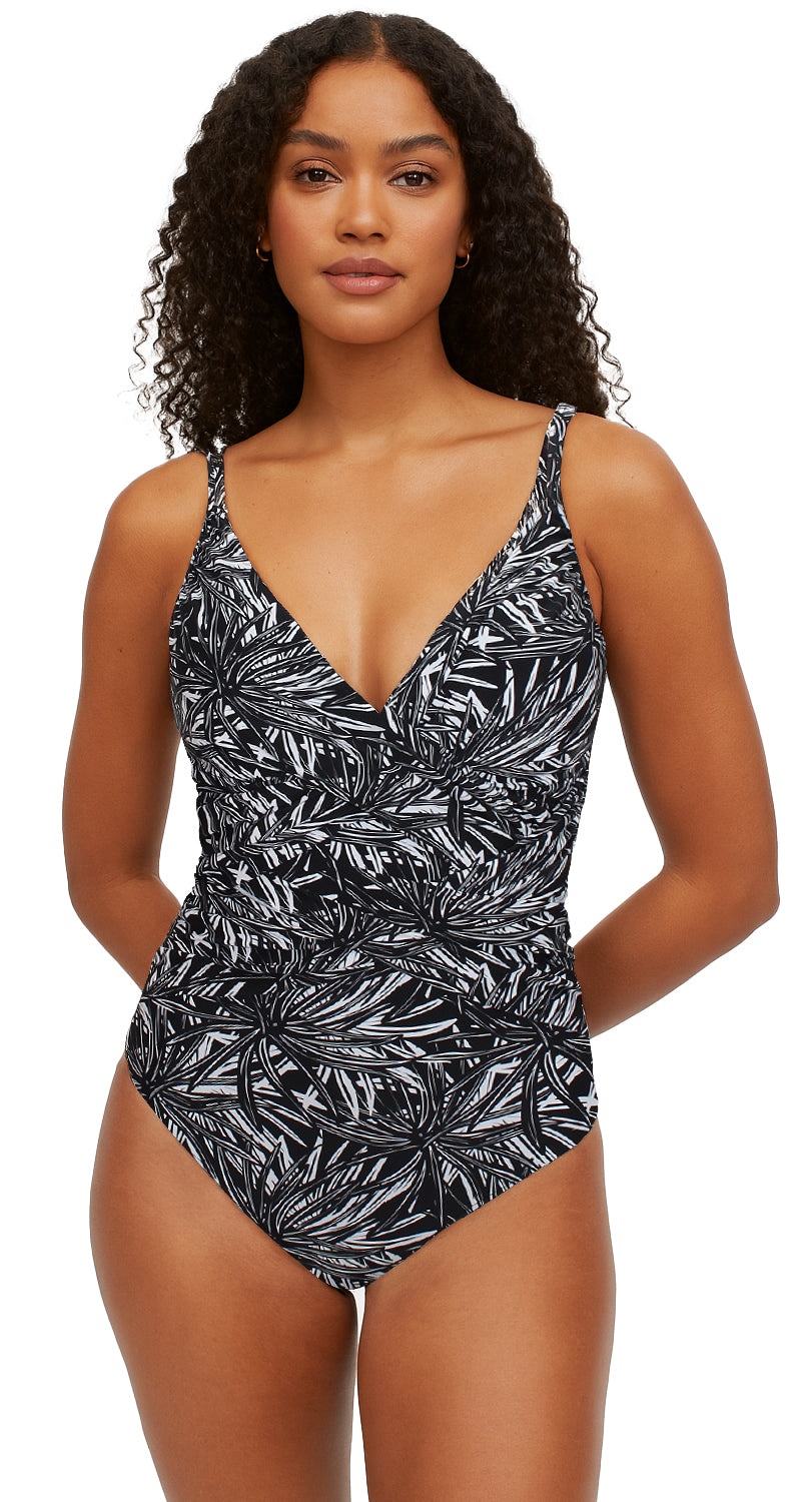 This one-piece style features a V-neckline with front criss-cross detail, side ruching, adjustable straps, and a scoop back. It is available in the “Night Waves” design only.