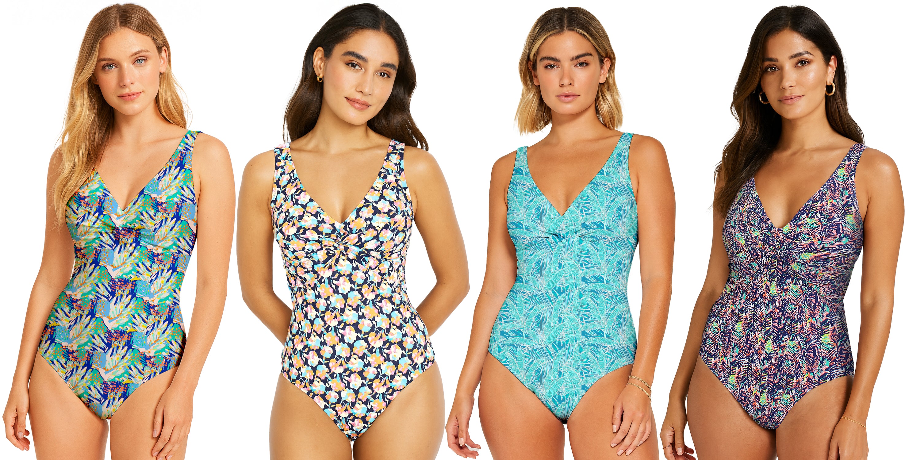 Wholesale women's printed twist-front one-piece swimsuit. Features soft-feel fabric a V-neckline and removable cups. Comes in 4 vibrant prints in sizes S - XL.