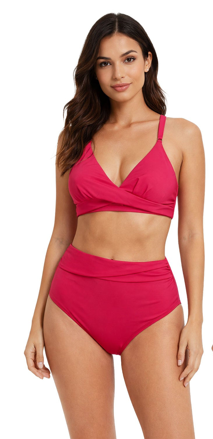 Elevate your swim assortment with this women’s cross-front two-piece swimsuit, designed to combine timeless style with a flattering, confident fit. The wrap-style balconette top enhances the bust while adjustable straps, removable soft cups, and a back tie closure provide customizable support and comfort. Paired with high-waisted bottoms featuring softly ruched sides, this set offers moderate coverage that smooths and shapes effortlessly. Crafted from a soft, stretchy nylon-spandex blend, it moves comfortably with the body for all-day wear. Available in an eye-catching, bold solid Dark Coral, this versatile style is perfect for resort, cruise, and summer collections.