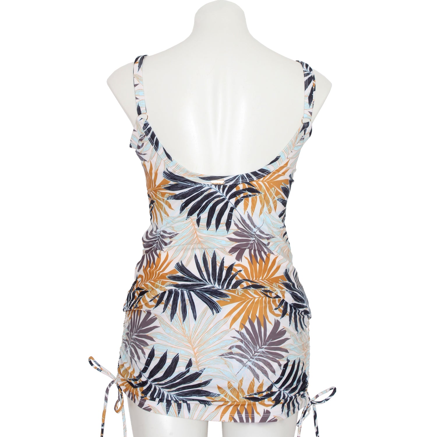 Wholesale women's skirtini with a V-neck, cross front top and matching skirted scrunch side swim bottoms in an all over palm leaf print. Comes in sizes S - XL.